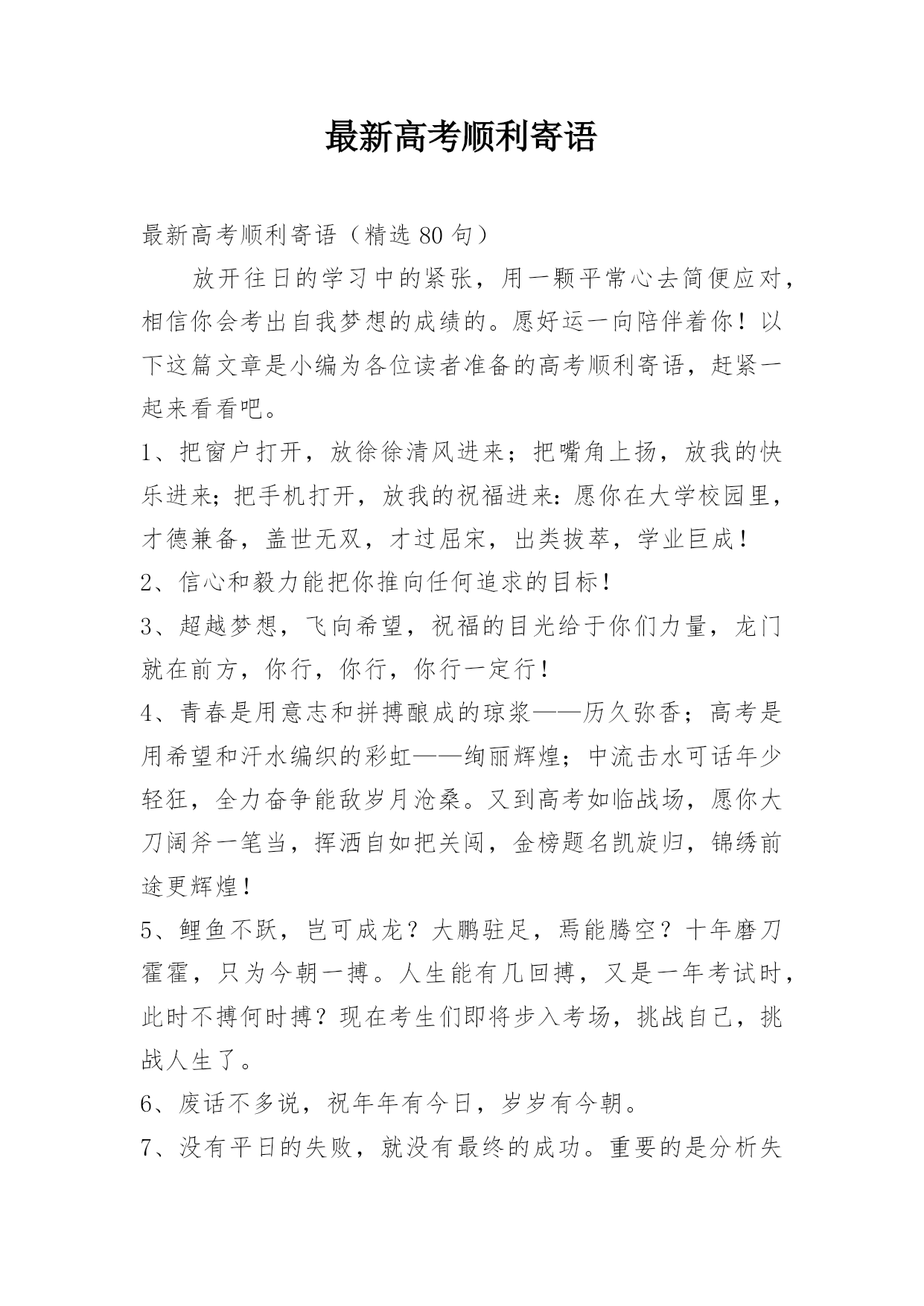 最新高考顺利寄语最新高考顺利寄语(精选80句)放开往日的学习中的紧张,用一颗平常心去简便应对,相信你会考出自我梦想的成绩的。愿好运一向陪伴着你!以下这篇文章是小编为各位读者准备的高考顺利寄语,赶紧一起来看看吧。1、把窗户打开,放徐徐清风进来;把嘴角上扬,放我的快乐进来;把手机打开,放我的祝福进来:愿你在大学校园里,才德兼备,盖世无双,才过屈宋,出类拔萃,学业巨成!2、信心和毅力能把你推向任何追求的目标!3、超越梦想,飞向希望,祝福的目光给于你们力量,龙门就在前方,你行,你行,你行一定行!4、青春是用意志和