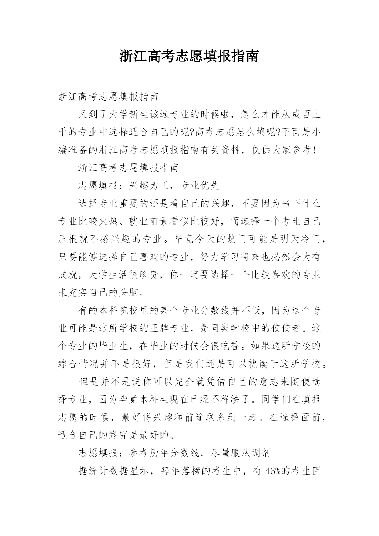 浙江高考志愿填报指南浙江高考志愿填报指南又到了大学新生该选专业的时候啦,怎么才能从成百上千的专业中选择适合自己的呢?高考志愿怎么填呢?下面是小编准备的浙江高考志愿填报指南有关资料,仅供大家参考!浙江高考志愿填报指南志愿填报:兴趣为王,专业优先选择专业重要的还是看自己的兴趣,不要因为当下什么专业比较火热、就业前景看似比较好,而选择一个考生自己压根就不感兴趣的专业。毕竟今天的热门可能是明天冷门,只要能够选择自己喜欢的专业,努力学习将来也必然会大有成就,大学生活很珍贵,你一定要选择一个比较喜欢的专业来充实自己的