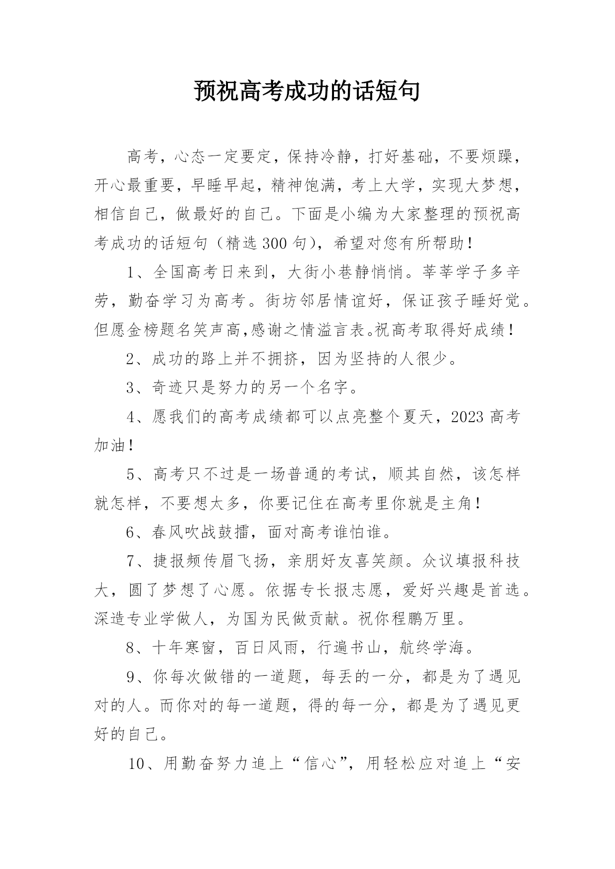 预祝高考成功的话短句高考,心态一定要定,保持冷静,打好基础,不要烦躁,开心最重要,早睡早起,精神饱满,考上大学,实现大梦想,相信自己,做最好的自己。下面是小编为大家整理的预祝高考成功的话短句(精选300句),希望对您有所帮助!1、全国高考日来到,大街小巷静悄悄。莘莘学子多辛劳,勤奋学习为高考。街坊邻居情谊好,保证孩子睡好觉。但愿金榜题名笑声高,感谢之情溢言表。祝高考取得好成绩!2、成功的路上并不拥挤,因为坚持的人很少。3、奇迹只是努力的另一个名字。4、愿我们的高考成绩都可以点亮整个夏天,2023高考加油!
