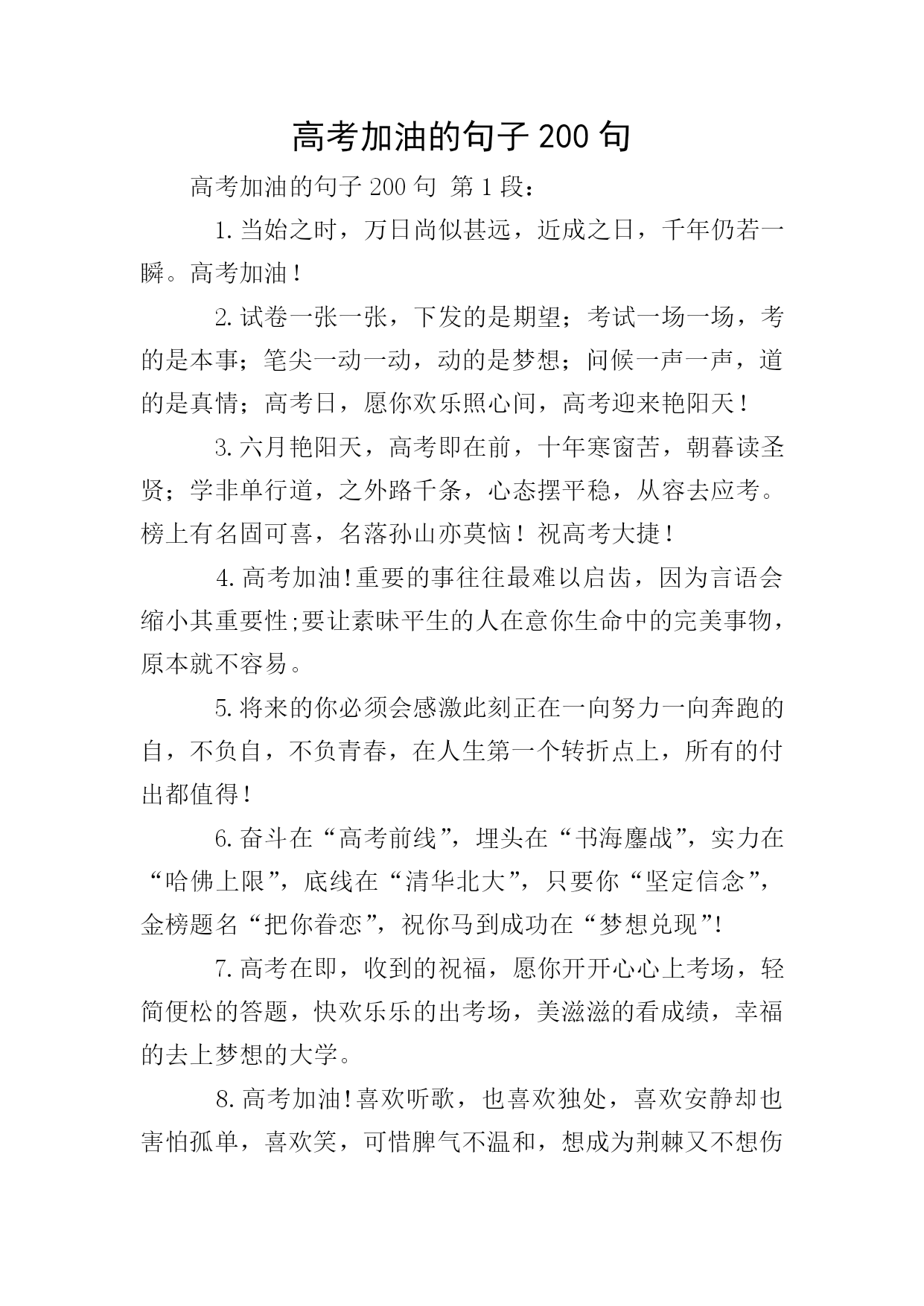 高考加油的句子200句高考加油的句子200句第1段:1.当始之时,万日尚似甚远,近成之日,千年仍若一瞬。高考加油!2.试卷一张一张,下发的是期望;考试一场一场,考的是本事;笔尖一动一动,动的是梦想;问候一声一声,道的是真情;高考日,愿你欢乐照心间,高考迎来艳阳天!3.六月艳阳天,高考即在前,十年寒窗苦,朝暮读圣贤;学非单行道,之外路千条,心态摆平稳,从容去应考。榜上有名固可喜,名落孙山亦莫恼!祝高考大捷!4.高考加油!重要的事往往最难以启齿,因为言语会缩小其重要性;要让素昧平生的人在意你生命中的完美事物,