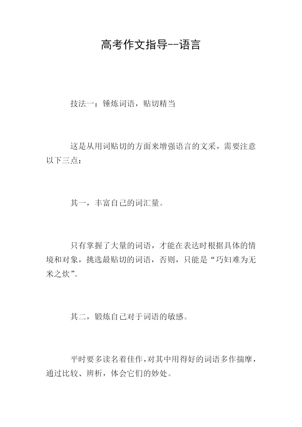 高考作文指导--语言技法一:锤炼词语,贴切精当这是从用词贴切的方面来增强语言的文采,需要注意以下三点:其一,丰富自己的词汇量。只有掌握了大量的词语,才能在表达时根据具体的情境和对象,挑选最贴切的词语,否则,只能是“巧妇难为无米之炊”。其二,锻炼自己对于词语的敏感。平时要多读名着佳作,对其中用得好的词语多作揣摩,通过比较、辨析,体会它们的妙处。其三,养成推敲自己文章词语的习惯。每一种事物,只有一个最恰当的名词;每一个动作,只有一个最恰当的动词;每一种状态,只有一个最恰当的形容词。所以我们要能在词汇的海洋里,
