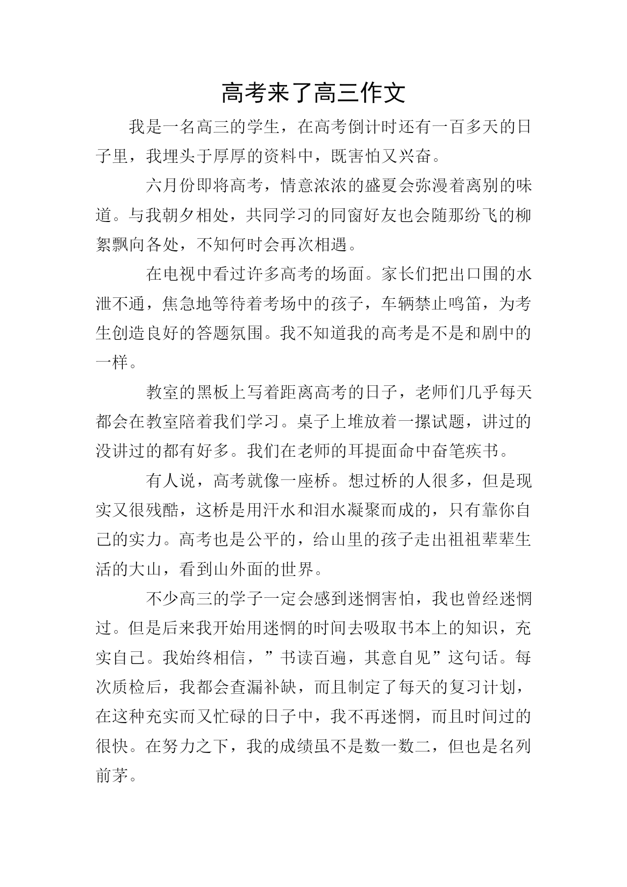 高考来了高三作文我是一名高三的学生,在高考倒计时还有一百多天的日子里,我埋头于厚厚的资料中,既害怕又兴奋。六月份即将高考,情意浓浓的盛夏会弥漫着离别的味道。与我朝夕相处,共同学习的同窗好友也会随那纷飞的柳絮飘向各处,不知何时会再次相遇。在电视中看过许多高考的场面。家长们把出口围的水泄不通,焦急地等待着考场中的孩子,车辆禁止鸣笛,为考生创造良好的答题氛围。我不知道我的高考是不是和剧中的一样。教室的黑板上写着距离高考的日子,老师们几乎每天都会在教室陪着我们学习。桌子上堆放着一摞试题,讲过的没讲过的都有好多。我