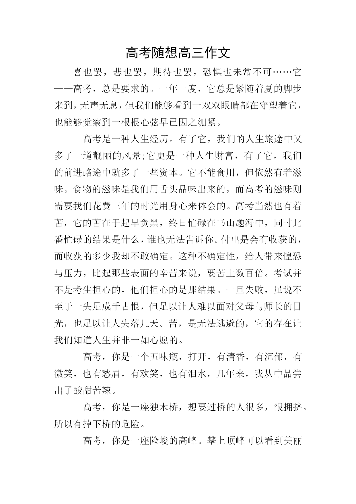 高考随想高三作文喜也罢,悲也罢,期待也罢,恐惧也未常不可……它——高考,总是要求的。一年一度,它总是紧随着夏的脚步来到,无声无息,但我们能够看到一双双眼睛都在守望着它,也能够觉察到一根根心弦早已因之绷紧。高考是一种人生经历。有了它,我们的人生旅途中又多了一道靓丽的风景;它更是一种人生财富,有了它,我们的前进路途中就多了一些资本。它不能食用,但依然有着滋味。食物的滋味是我们用舌头品味出来的,而高考的滋味则需要我们花费三年的时光用身心来体会的。高考当然也有着苦,它的苦在于起早贪黑,终日忙碌在书山题海中,同时此
