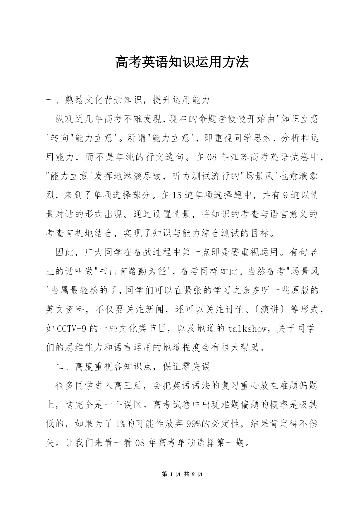 第PAGE\*MERGEFORMAT9页共NUMPAGES\*MERGEFORMAT9页高考英语知识运用方法一、熟悉文化背景知识,提升运用能力纵观近几年高考不难发现,现在的命题者慢慢开始由"知识立意'转向"能力立意'。所谓"能力立意',即重视同学思索、分析和运用能力,而不是单纯的行文造句。在08年江苏高考英语试卷中,"能力立意'发挥地淋漓尽致,听力测试流行的"场景风'也愈演愈烈,来到了单项选择部分。在15道单项选择题中,共有9道以情景对话的形式出现。通过设置情景,将知识的考查与语言意义的考查有