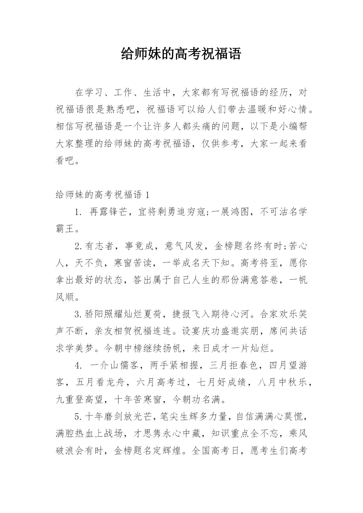 给师妹的高考祝福语在学习、工作、生活中,大家都有写祝福语的经历,对祝福语很是熟悉吧,祝福语可以给人们带去温暖和好心情。相信写祝福语是一个让许多人都头痛的问题,以下是小编帮大家整理的给师妹的高考祝福语,仅供参考,大家一起来看看吧。给师妹的高考祝福语11.再露锋芒,宜将剩勇追穷寇;一展鸿图,不可沽名学霸王。2.有志者,事竟成,意气风发,金榜题名终有时;苦心人,天不负,寒窗苦读,一举成名天下知。高考将至,愿你拿出最好的状态,答出属于自己人生的那份满意答卷,一帆风顺。3.骄阳照耀灿烂夏荷,捷报飞入期待心河。合家欢