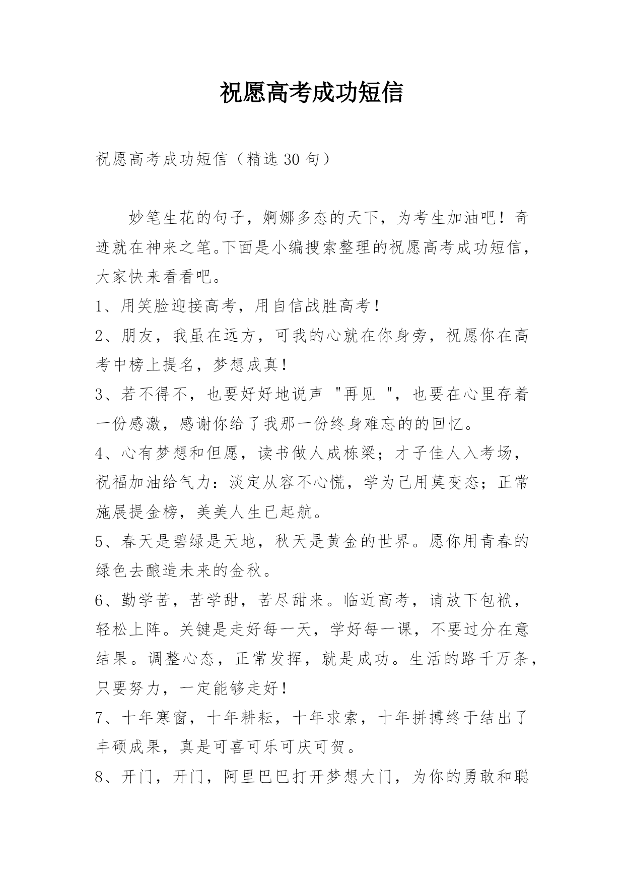 祝愿高考成功短信祝愿高考成功短信(精选30句)妙笔生花的句子,婀娜多态的天下,为考生加油吧!奇迹就在神来之笔。下面是小编搜索整理的祝愿高考成功短信,大家快来看看吧。1、用笑脸迎接高考,用自信战胜高考!2、朋友,我虽在远方,可我的心就在你身旁,祝愿你在高考中榜上提名,梦想成真!3、若不得不,也要好好地说声"再见",也要在心里存着一份感激,感谢你给了我那一份终身难忘的的回忆。4、心有梦想和但愿,读书做人成栋梁;才子佳人入考场,祝福加油给气力:淡定从容不心慌,学为己用莫变态;正常施展提金榜,美美人生已起航。5、