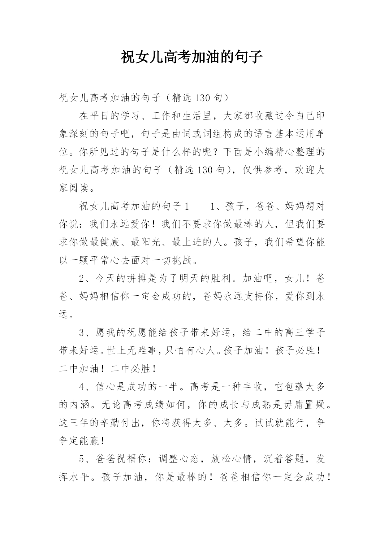 祝女儿高考加油的句子祝女儿高考加油的句子(精选130句)在平日的学习、工作和生活里,大家都收藏过令自己印象深刻的句子吧,句子是由词或词组构成的语言基本运用单位。你所见过的句子是什么样的呢?下面是小编精心整理的祝女儿高考加油的句子(精选130句),仅供参考,欢迎大家阅读。祝女儿高考加油的句子11、孩子,爸爸、妈妈想对你说:我们永远爱你!我们不要求你做最棒的人,但我们要求你做最健康、最阳光、最上进的人。孩子,我们希望你能以一颗平常心去面对一切挑战。2、今天的拼搏是为了明天的胜利。加油吧,女儿!爸爸、妈妈相信你