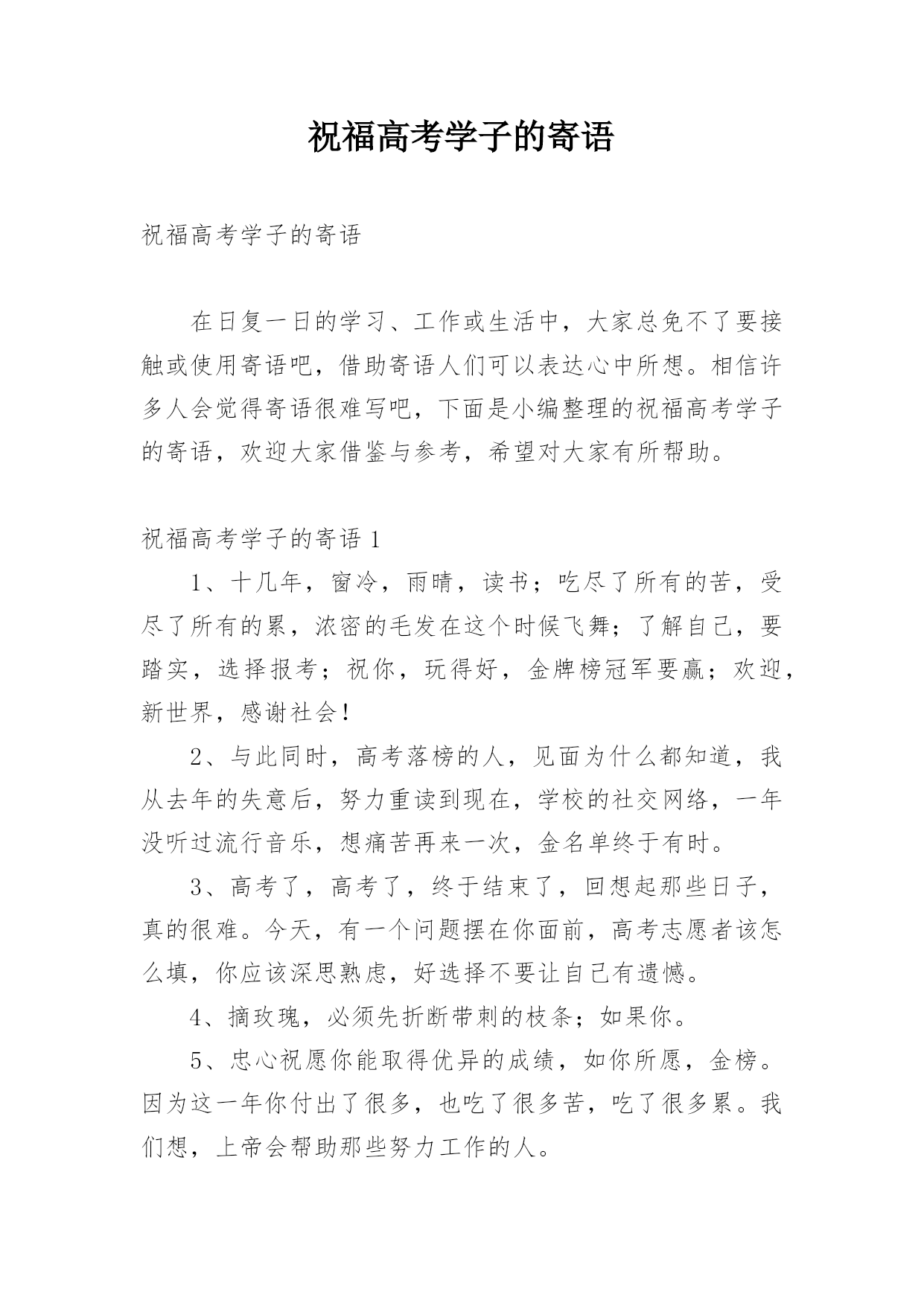 祝福高考学子的寄语祝福高考学子的寄语在日复一日的学习、工作或生活中,大家总免不了要接触或使用寄语吧,借助寄语人们可以表达心中所想。相信许多人会觉得寄语很难写吧,下面是小编整理的祝福高考学子的寄语,欢迎大家借鉴与参考,希望对大家有所帮助。祝福高考学子的寄语11、十几年,窗冷,雨晴,读书;吃尽了所有的苦,受尽了所有的累,浓密的毛发在这个时候飞舞;了解自己,要踏实,选择报考;祝你,玩得好,金牌榜冠军要赢;欢迎,新世界,感谢社会!2、与此同时,高考落榜的人,见面为什么都知道,我从去年的失意后,努力重读到现在,学校