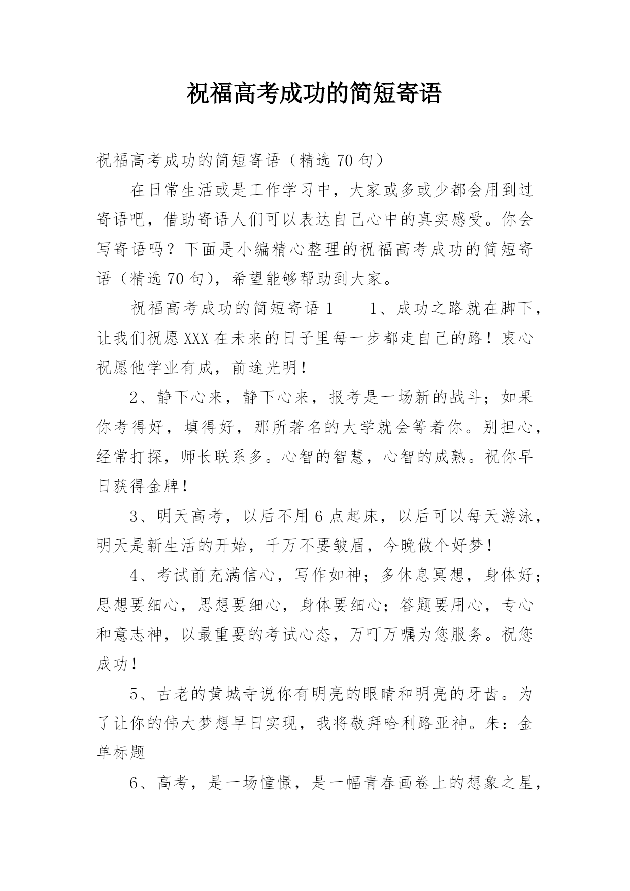 祝福高考成功的简短寄语祝福高考成功的简短寄语(精选70句)在日常生活或是工作学习中,大家或多或少都会用到过寄语吧,借助寄语人们可以表达自己心中的真实感受。你会写寄语吗?下面是小编精心整理的祝福高考成功的简短寄语(精选70句),希望能够帮助到大家。祝福高考成功的简短寄语11、成功之路就在脚下,让我们祝愿XXX在未来的日子里每一步都走自己的路!衷心祝愿他学业有成,前途光明!2、静下心来,静下心来,报考是一场新的战斗;如果你考得好,填得好,那所著名的大学就会等着你。别担心,经常打探,师长联系多。心智的智慧,心智