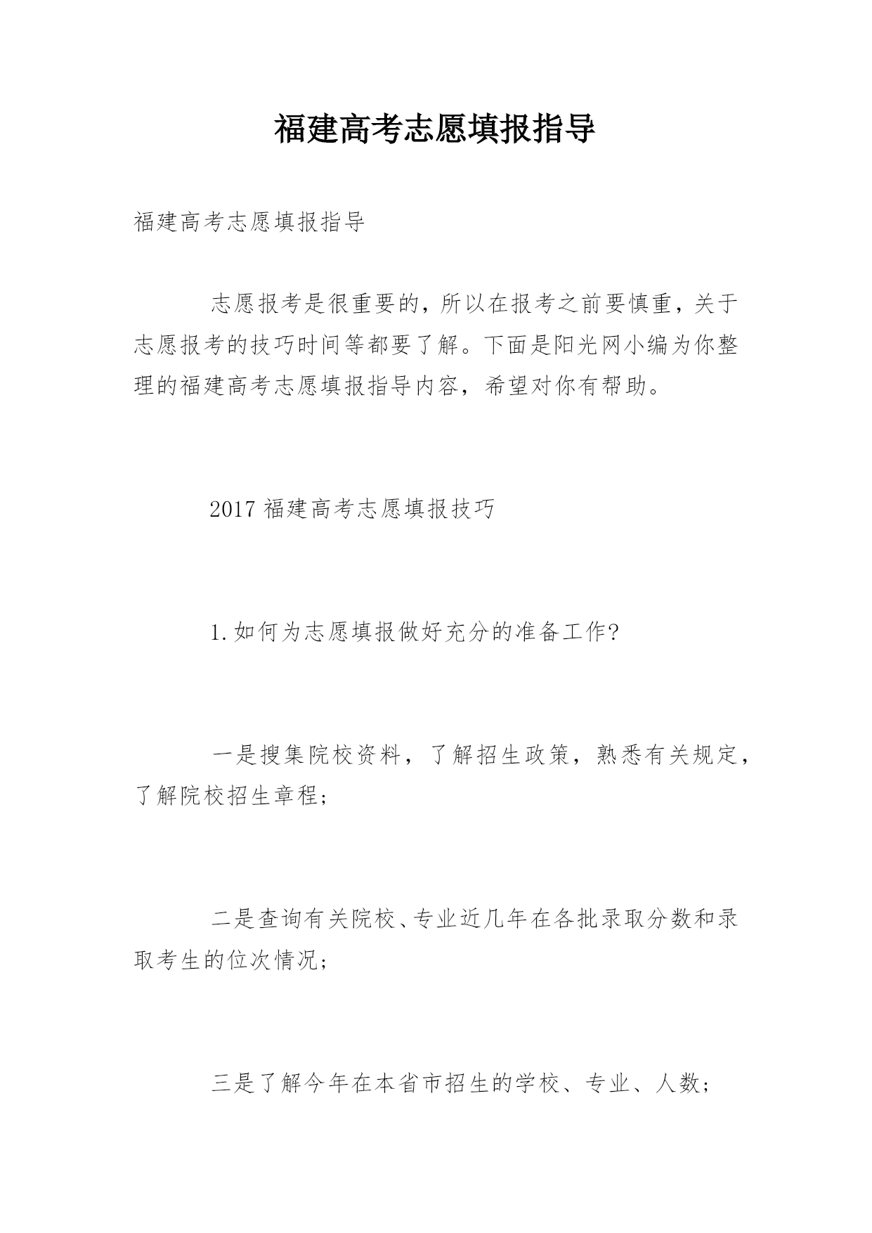 福建高考志愿填报指导福建高考志愿填报指导志愿报考是很重要的,所以在报考之前要慎重,关于志愿报考的技巧时间等都要了解。下面是阳光网小编为你整理的福建高考志愿填报指导内容,希望对你有帮助。2017福建高考志愿填报技巧1.如何为志愿填报做好充分的准备工作?一是搜集院校资料,了解招生政策,熟悉有关规定,了解院校招生章程;二是查询有关院校、专业近几年在各批录取分数和录取考生的位次情况;三是了解今年在本省市招生的学校、专业、人数;四是了解自己平时成绩、模拟成绩在全省、市的位次;五是了解本人体检结果,避开限报的学校、专