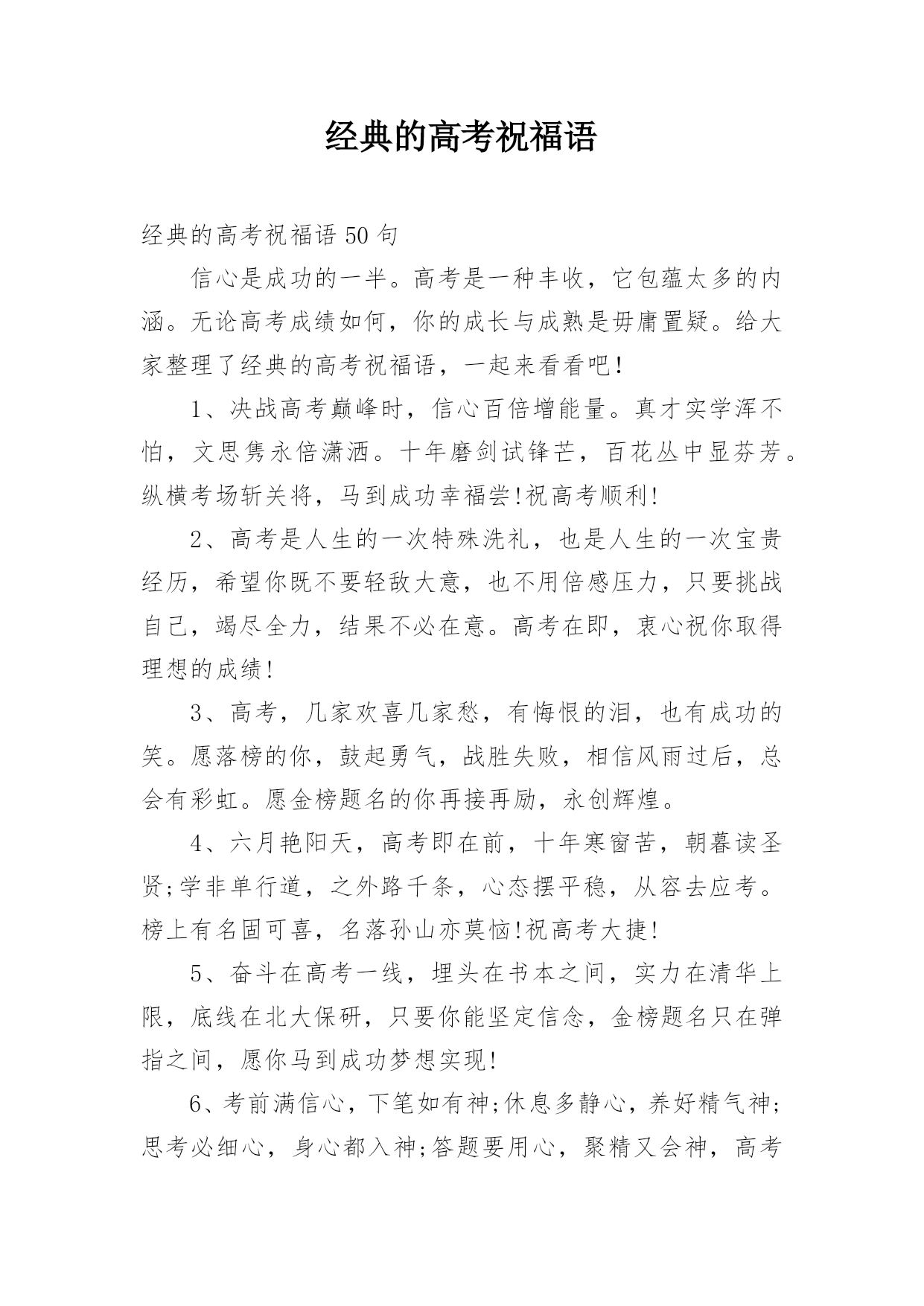 经典的高考祝福语经典的高考祝福语50句信心是成功的一半。高考是一种丰收,它包蕴太多的内涵。无论高考成绩如何,你的成长与成熟是毋庸置疑。给大家整理了经典的高考祝福语,一起来看看吧!1、决战高考巅峰时,信心百倍增能量。真才实学浑不怕,文思隽永倍潇洒。十年磨剑试锋芒,百花丛中显芬芳。纵横考场斩关将,马到成功幸福尝!祝高考顺利!2、高考是人生的一次特殊洗礼,也是人生的一次宝贵经历,希望你既不要轻敌大意,也不用倍感压力,只要挑战自己,竭尽全力,结果不必在意。高考在即,衷心祝你取得理想的成绩!3、高考,几家欢喜几家愁