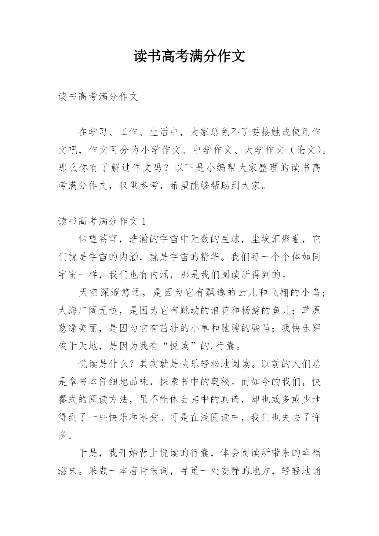 读书高考满分作文读书高考满分作文在学习、工作、生活中,大家总免不了要接触或使用作文吧,作文可分为小学作文、中学作文、大学作文(论文)。那么你有了解过作文吗?以下是小编帮大家整理的读书高考满分作文,仅供参考,希望能够帮助到大家。读书高考满分作文1仰望苍穹,浩瀚的宇宙中无数的星球,尘埃汇聚着,它们就是宇宙的内涵,就是宇宙的精华。我们每一个个体如同宇宙一样,我们也有内涵,那是我们阅读所得到的。天空深邃悠远,是因为它有飘逸的云儿和飞翔的小鸟;大海广阔无边,是因为它有跳动的浪花和畅游的鱼儿;草原葱绿美丽,是因为它有