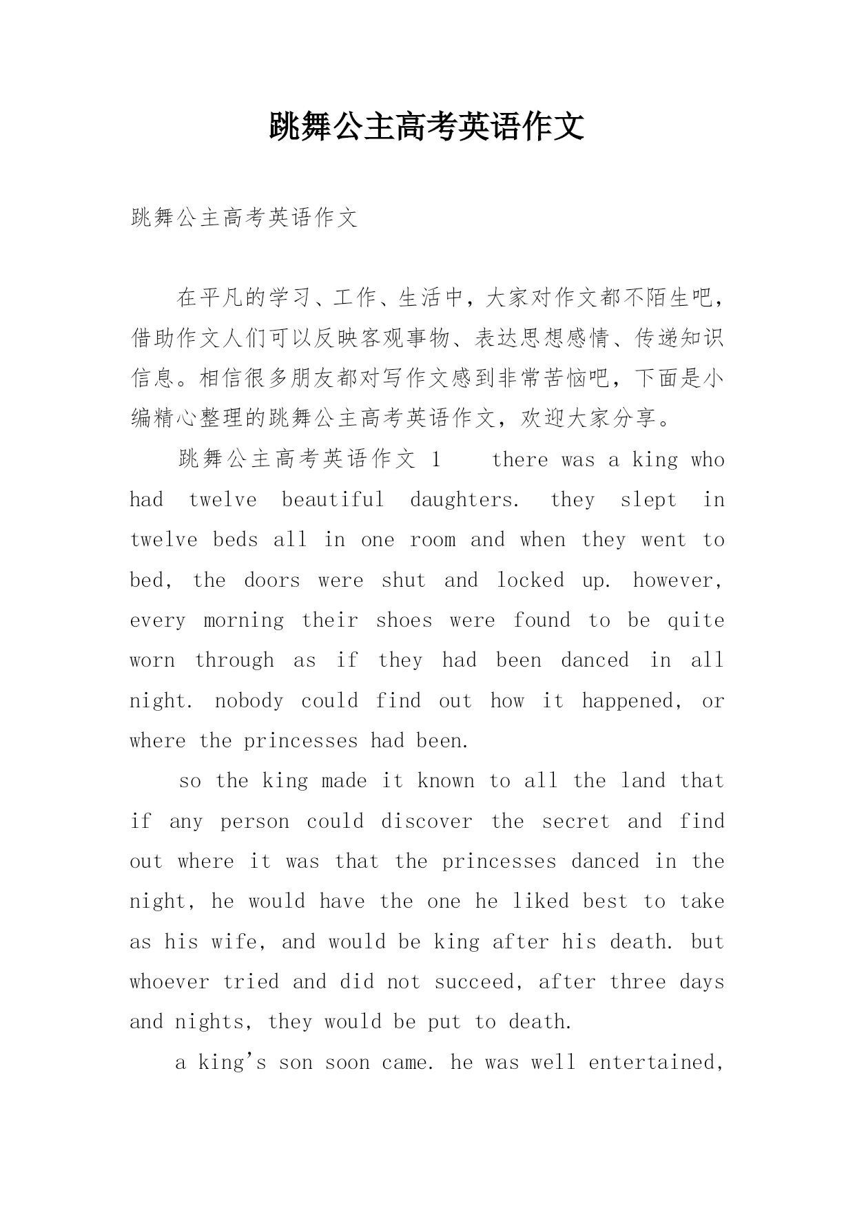 跳舞公主高考英语作文跳舞公主高考英语作文在平凡的学习、工作、生活中,大家对作文都不陌生吧,借助作文人们可以反映客观事物、表达思想感情、传递知识信息。相信很多朋友都对写作文感到非常苦恼吧,下面是小编精心整理的跳舞公主高考英语作文,欢迎大家分享。跳舞公主高考英语作文1therewasakingwhohadtwelvebeautifuldaughters.theysleptintwelvebedsallinoneroomandwhentheywenttobed,thedoorswereshutandlocked