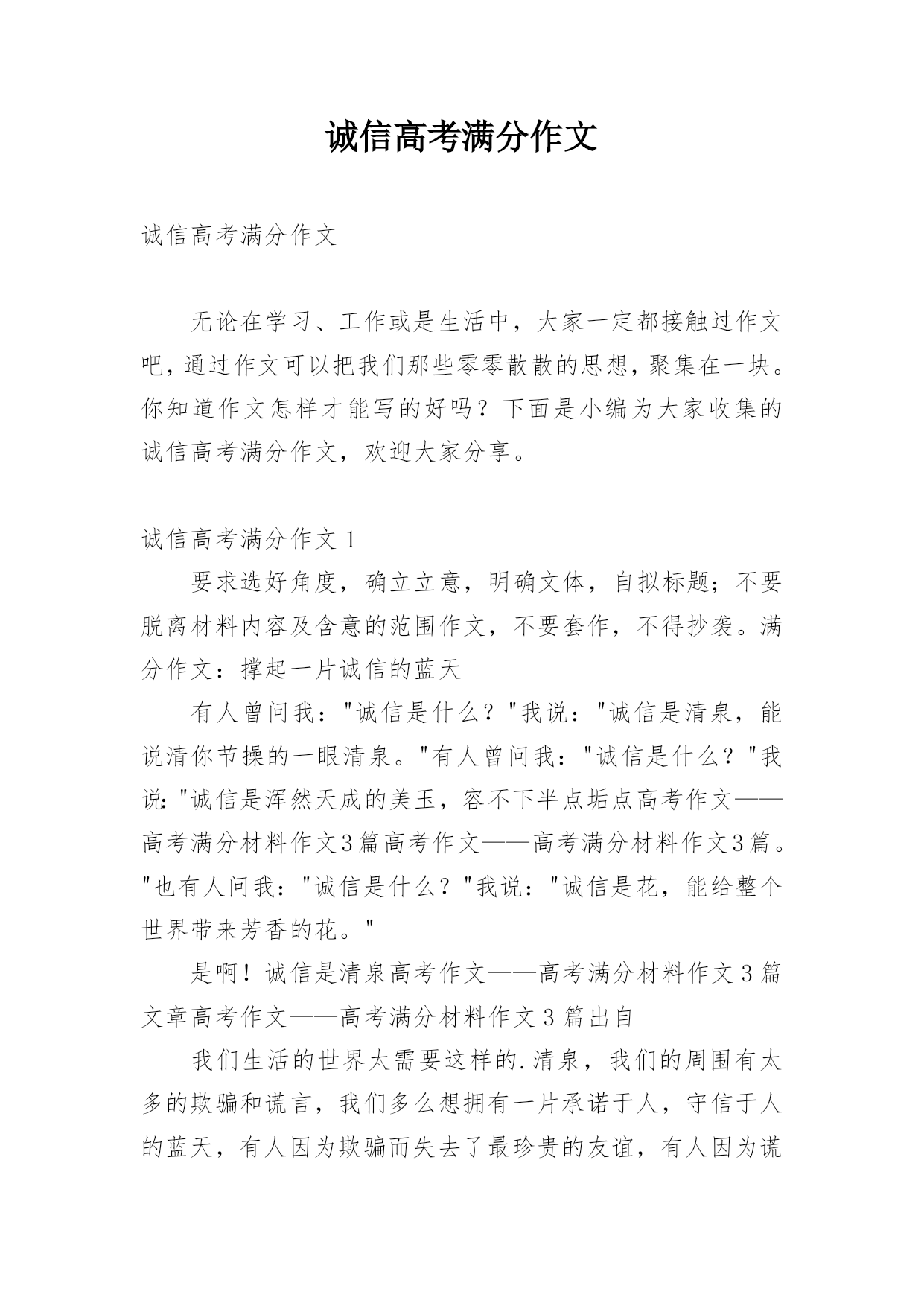 诚信高考满分作文诚信高考满分作文无论在学习、工作或是生活中,大家一定都接触过作文吧,通过作文可以把我们那些零零散散的思想,聚集在一块。你知道作文怎样才能写的好吗?下面是小编为大家收集的诚信高考满分作文,欢迎大家分享。诚信高考满分作文1要求选好角度,确立立意,明确文体,自拟标题;不要脱离材料内容及含意的范围作文,不要套作,不得抄袭。满分作文:撑起一片诚信的蓝天有人曾问我:"诚信是什么?"我说:"诚信是清泉,能说清你节操的一眼清泉。"有人曾问我:"诚信是什么?"我说:"诚信是浑然天成的美玉,容不下半点垢点高考