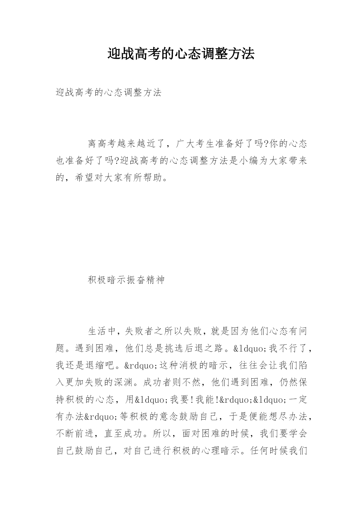 迎战高考的心态调整方法迎战高考的心态调整方法离高考越来越近了,广大考生准备好了吗?你的心态也准备好了吗?迎战高考的心态调整方法是小编为大家带来的,希望对大家有所帮助。积极暗示振奋精神生活中,失败者之所以失败,就是因为他们心态有问题。遇到困难,他们总是挑选后退之路。“我不行了,我还是退缩吧。”这种消极的暗示,往往会让我们陷入更加失败的深渊。成功者则不然,他们遇到困难,仍然保持积极的心态,用“我要!我能!”“一定有办法”等积极的意念鼓励自