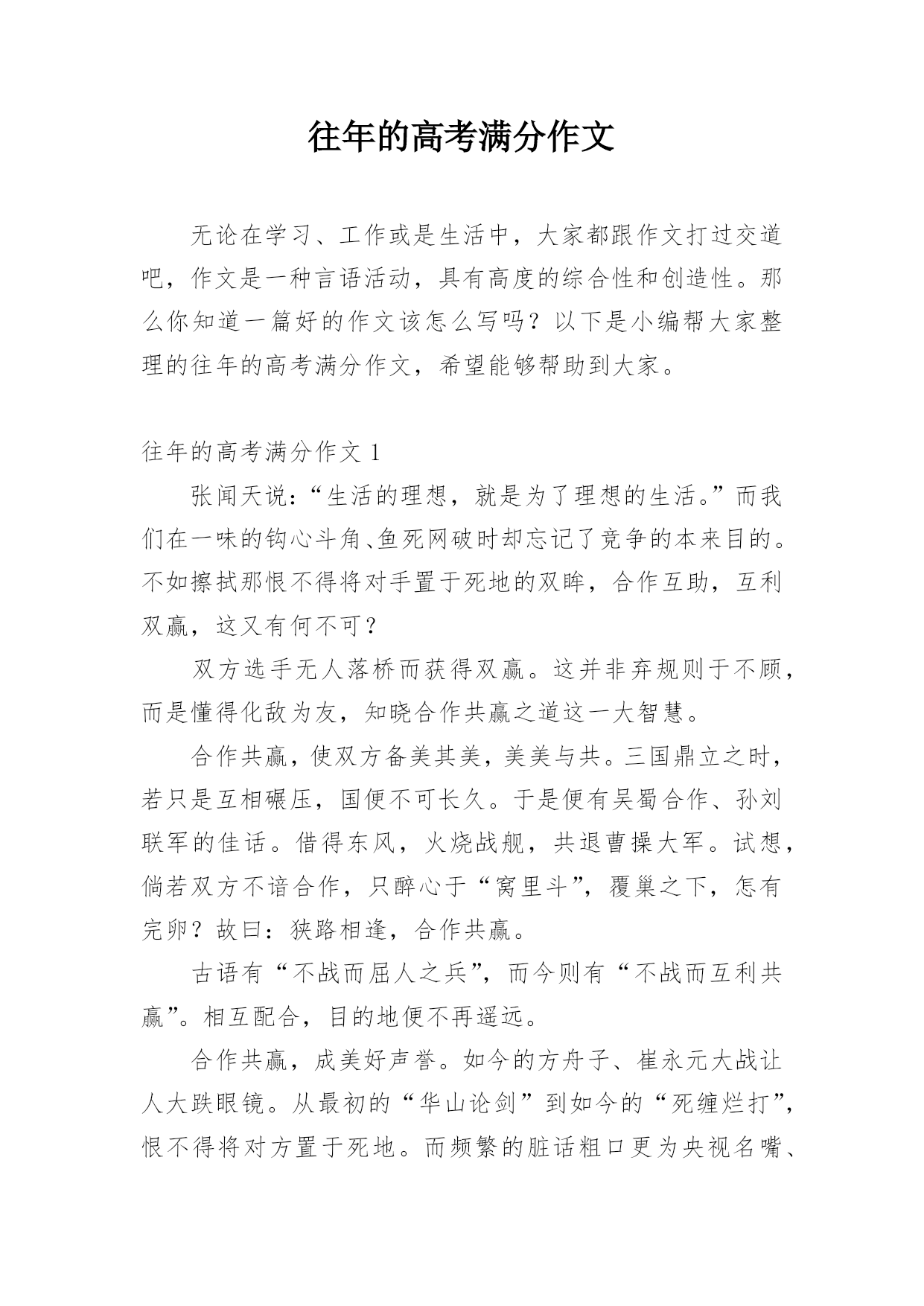往年的高考满分作文无论在学习、工作或是生活中,大家都跟作文打过交道吧,作文是一种言语活动,具有高度的综合性和创造性。那么你知道一篇好的作文该怎么写吗?以下是小编帮大家整理的往年的高考满分作文,希望能够帮助到大家。往年的高考满分作文1张闻天说:“生活的理想,就是为了理想的生活。”而我们在一味的钩心斗角、鱼死网破时却忘记了竞争的本来目的。不如擦拭那恨不得将对手置于死地的双眸,合作互助,互利双赢,这又有何不可?双方选手无人落桥而获得双赢。这并非弃规则于不顾,而是懂得化敌为友,知晓合作共赢之道这一大智慧。合作共赢