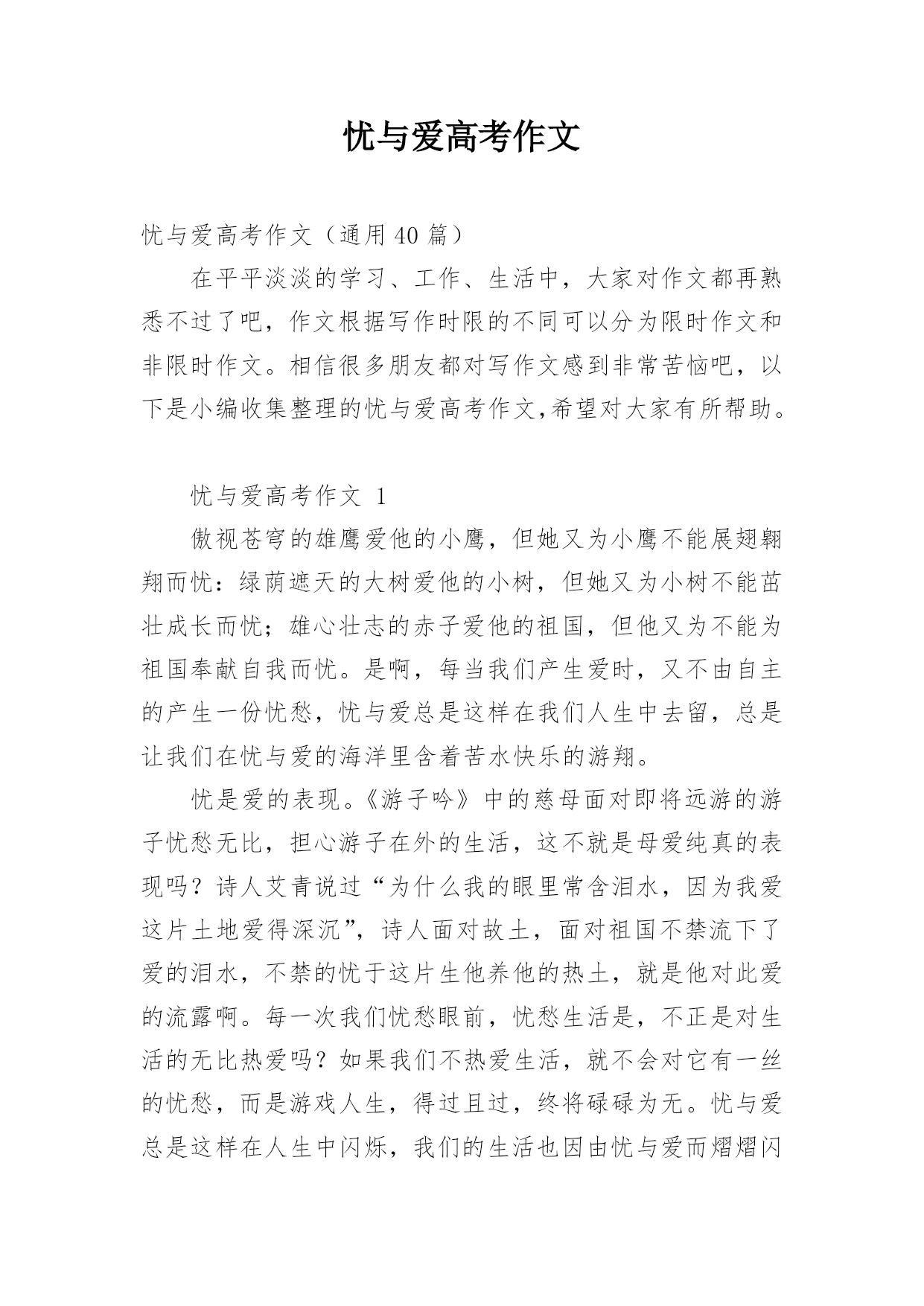 忧与爱高考作文忧与爱高考作文(通用40篇)在平平淡淡的学习、工作、生活中,大家对作文都再熟悉不过了吧,作文根据写作时限的不同可以分为限时作文和非限时作文。相信很多朋友都对写作文感到非常苦恼吧,以下是小编收集整理的忧与爱高考作文,希望对大家有所帮助。忧与爱高考作文1傲视苍穹的雄鹰爱他的小鹰,但她又为小鹰不能展翅翱翔而忧:绿荫遮天的大树爱他的小树,但她又为小树不能茁壮成长而忧;雄心壮志的赤子爱他的祖国,但他又为不能为祖国奉献自我而忧。是啊,每当我们产生爱时,又不由自主的产生一份忧愁,忧与爱总是这样在我们人生中