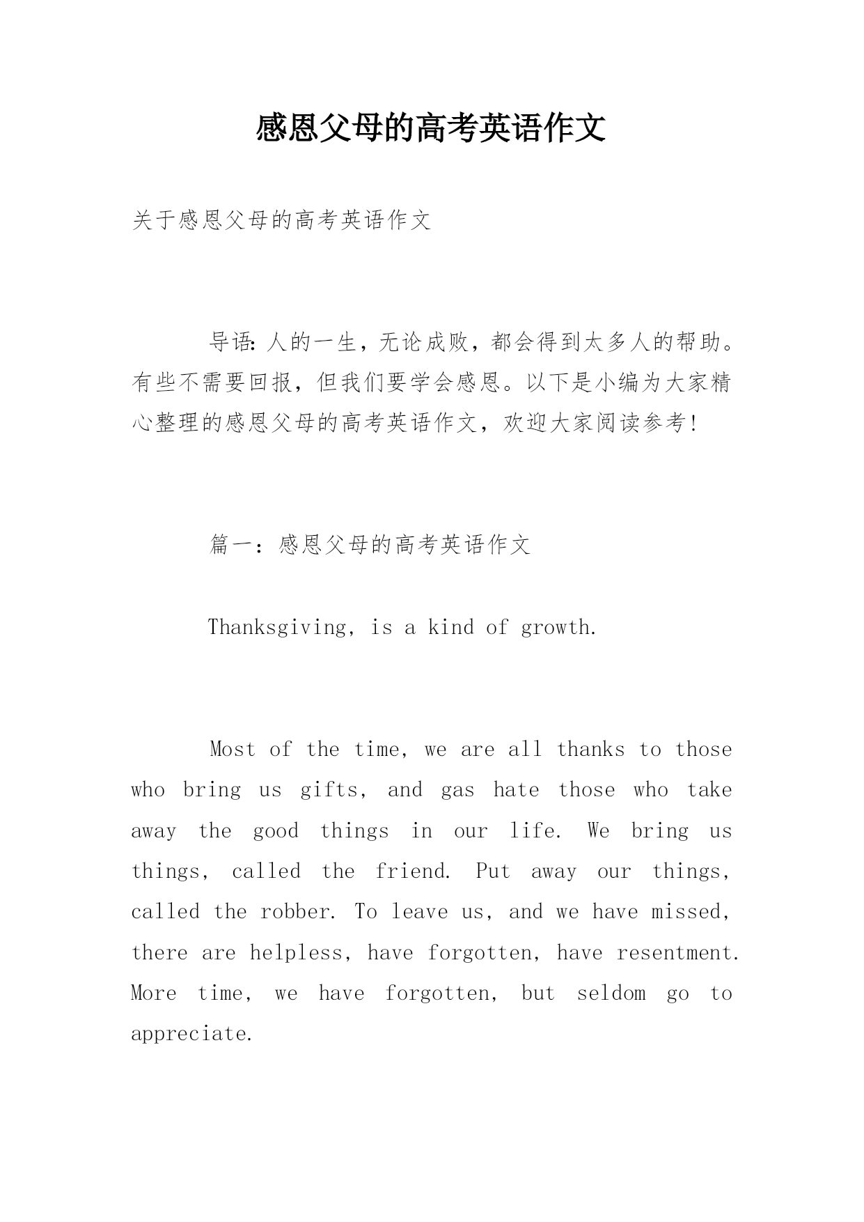 感恩父母的高考英语作文关于感恩父母的高考英语作文导语:人的一生,无论成败,都会得到太多人的帮助。有些不需要回报,但我们要学会感恩。以下是小编为大家精心整理的感恩父母的高考英语作文,欢迎大家阅读参考!篇一:感恩父母的高考英语作文Thanksgiving,isakindofgrowth.Mostofthetime,weareallthankstothosewhobringusgifts,andgashatethosewhotakeawaythegoodthingsinourlife.Webringusthin