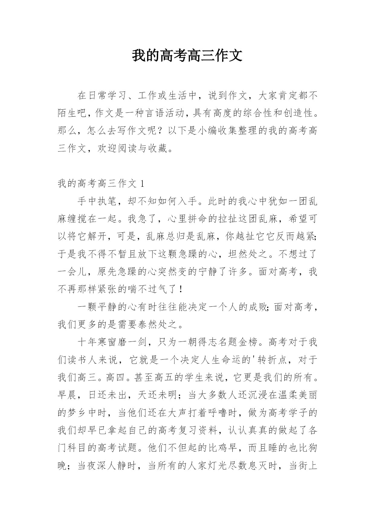 我的高考高三作文在日常学习、工作或生活中,说到作文,大家肯定都不陌生吧,作文是一种言语活动,具有高度的综合性和创造性。那么,怎么去写作文呢?以下是小编收集整理的我的高考高三作文,欢迎阅读与收藏。我的高考高三作文1手中执笔,却不知如何入手。此时的我心中犹如一团乱麻缠搅在一起。我急了,心里拼命的拉扯这团乱麻,希望可以将它解开,可是,乱麻总归是乱麻,你越扯它它反而越紧;于是我不得不暂且放下这颗急躁的心,坦然处之。不想过了一会儿,原先急躁的心突然变的宁静了许多。面对高考,我不再那样紧张的喘不过气了!一颗平静的心有