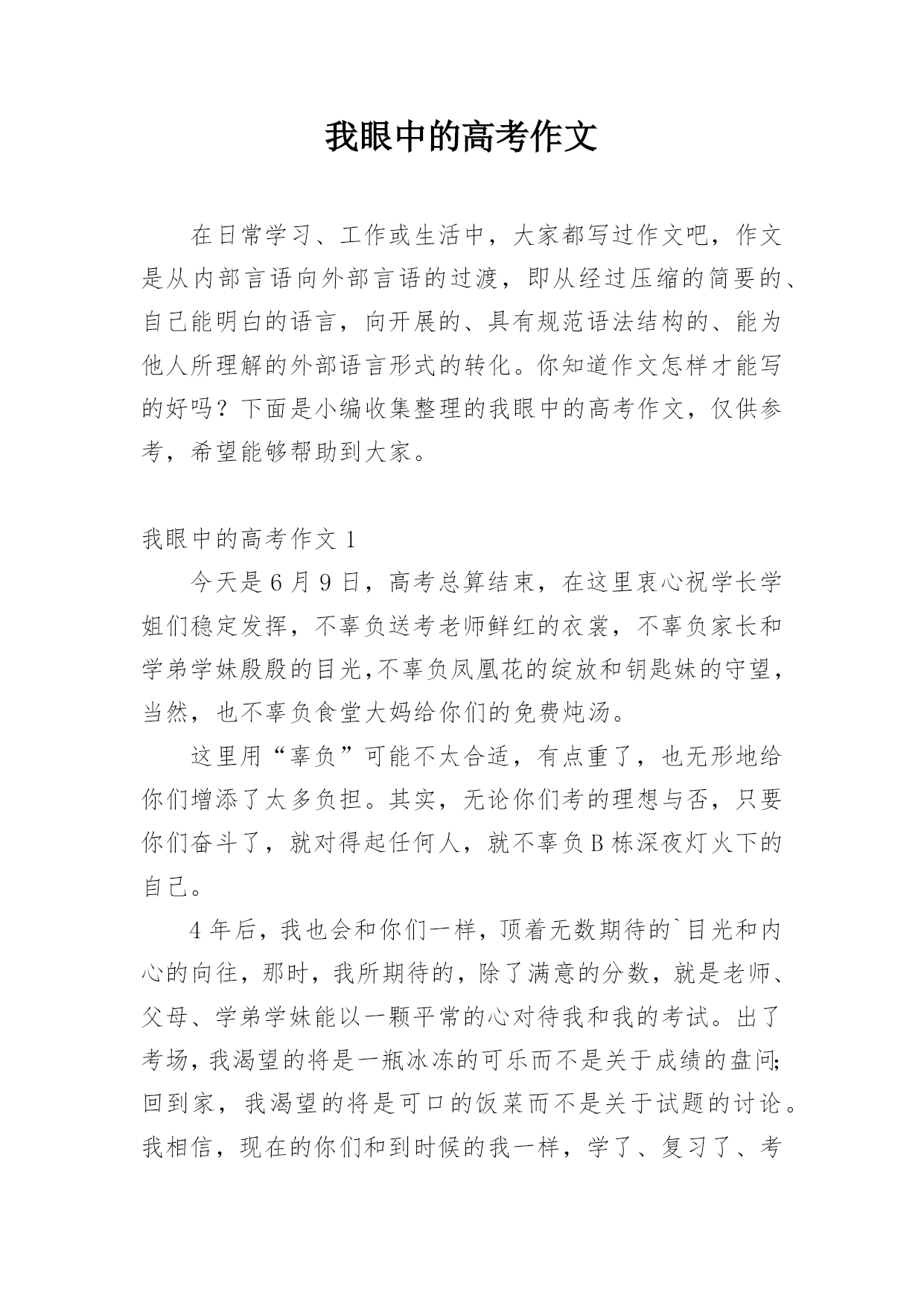 我眼中的高考作文在日常学习、工作或生活中,大家都写过作文吧,作文是从内部言语向外部言语的过渡,即从经过压缩的简要的、自己能明白的语言,向开展的、具有规范语法结构的、能为他人所理解的外部语言形式的转化。你知道作文怎样才能写的好吗?下面是小编收集整理的我眼中的高考作文,仅供参考,希望能够帮助到大家。我眼中的高考作文1今天是6月9日,高考总算结束,在这里衷心祝学长学姐们稳定发挥,不辜负送考老师鲜红的衣裳,不辜负家长和学弟学妹殷殷的目光,不辜负凤凰花的绽放和钥匙妹的守望,当然,也不辜负食堂大妈给你们的免费炖汤。这