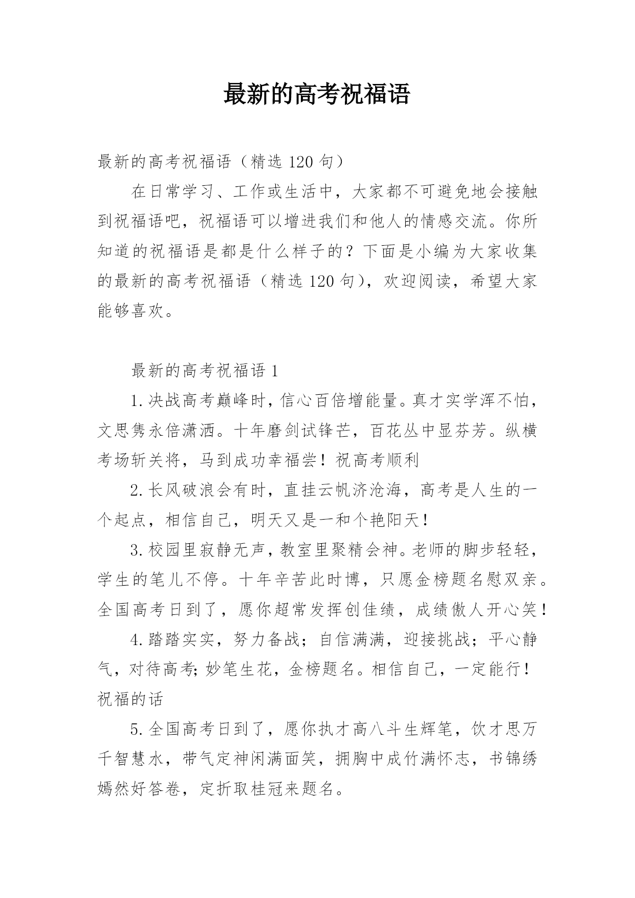 最新的高考祝福语最新的高考祝福语(精选120句)在日常学习、工作或生活中,大家都不可避免地会接触到祝福语吧,祝福语可以增进我们和他人的情感交流。你所知道的祝福语是都是什么样子的?下面是小编为大家收集的最新的高考祝福语(精选120句),欢迎阅读,希望大家能够喜欢。最新的高考祝福语11.决战高考巅峰时,信心百倍增能量。真才实学浑不怕,文思隽永倍潇洒。十年磨剑试锋芒,百花丛中显芬芳。纵横考场斩关将,马到成功幸福尝!祝高考顺利2.长风破浪会有时,直挂云帆济沧海,高考是人生的一个起点,相信自己,明天又是一和个艳阳天