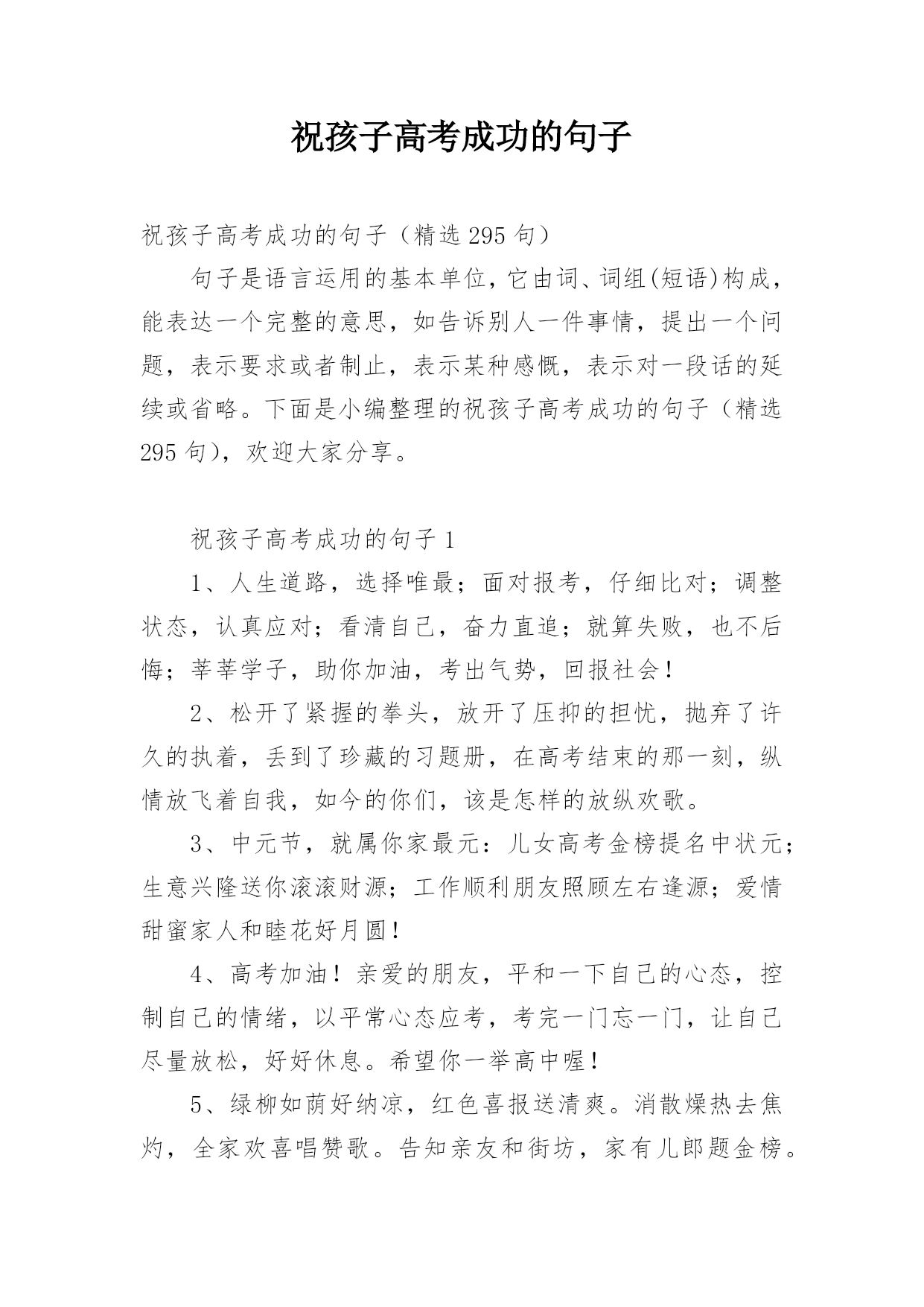 祝孩子高考成功的句子祝孩子高考成功的句子(精选295句)句子是语言运用的基本单位,它由词、词组(短语)构成,能表达一个完整的意思,如告诉别人一件事情,提出一个问题,表示要求或者制止,表示某种感慨,表示对一段话的延续或省略。下面是小编整理的祝孩子高考成功的句子(精选295句),欢迎大家分享。祝孩子高考成功的句子11、人生道路,选择唯最;面对报考,仔细比对;调整状态,认真应对;看清自己,奋力直追;就算失败,也不后悔;莘莘学子,助你加油,考出气势,回报社会!2、松开了紧握的拳头,放开了压抑的担忧,抛弃了许久的执