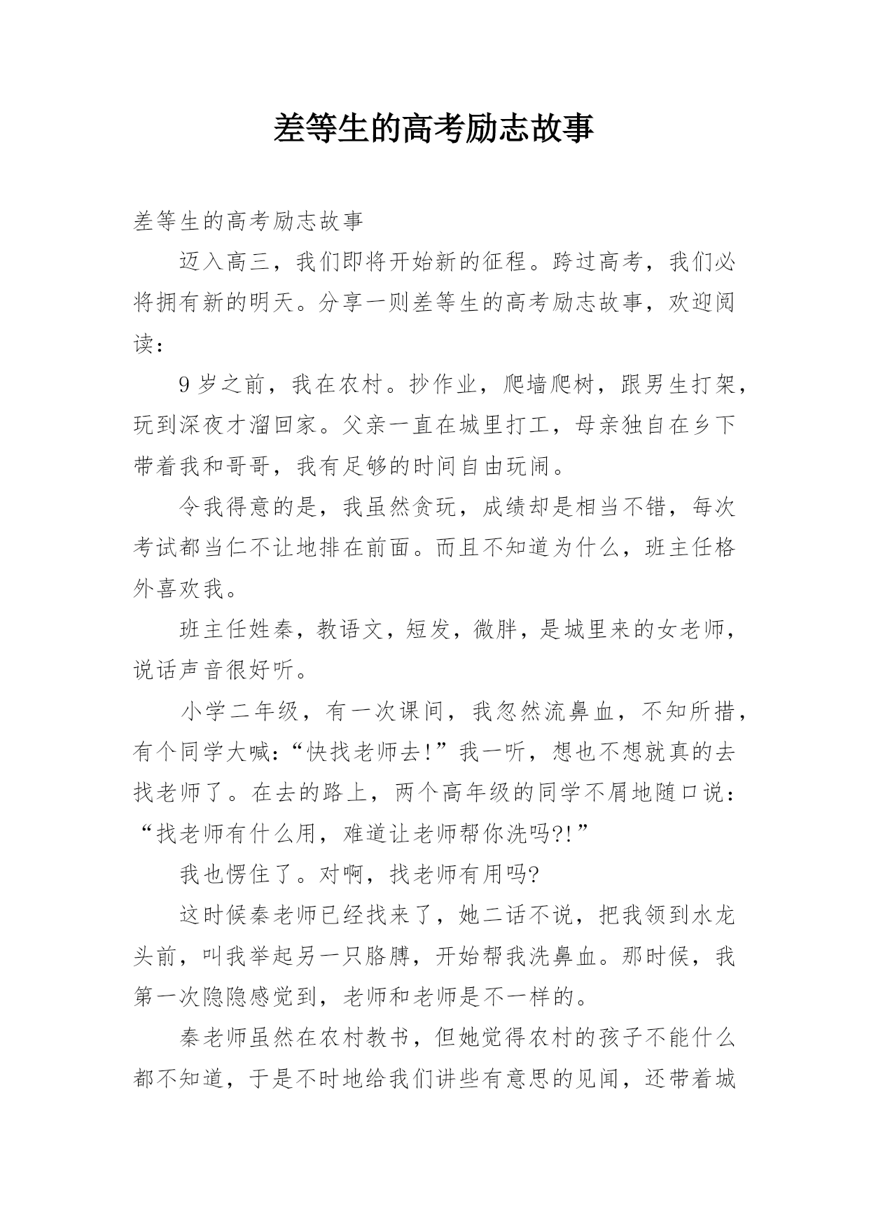 差等生的高考励志故事差等生的高考励志故事迈入高三,我们即将开始新的征程。跨过高考,我们必将拥有新的明天。分享一则差等生的高考励志故事,欢迎阅读:9岁之前,我在农村。抄作业,爬墙爬树,跟男生打架,玩到深夜才溜回家。父亲一直在城里打工,母亲独自在乡下带着我和哥哥,我有足够的时间自由玩闹。令我得意的是,我虽然贪玩,成绩却是相当不错,每次考试都当仁不让地排在前面。而且不知道为什么,班主任格外喜欢我。班主任姓秦,教语文,短发,微胖,是城里来的女老师,说话声音很好听。小学二年级,有一次课间,我忽然流鼻血,不知所措,有