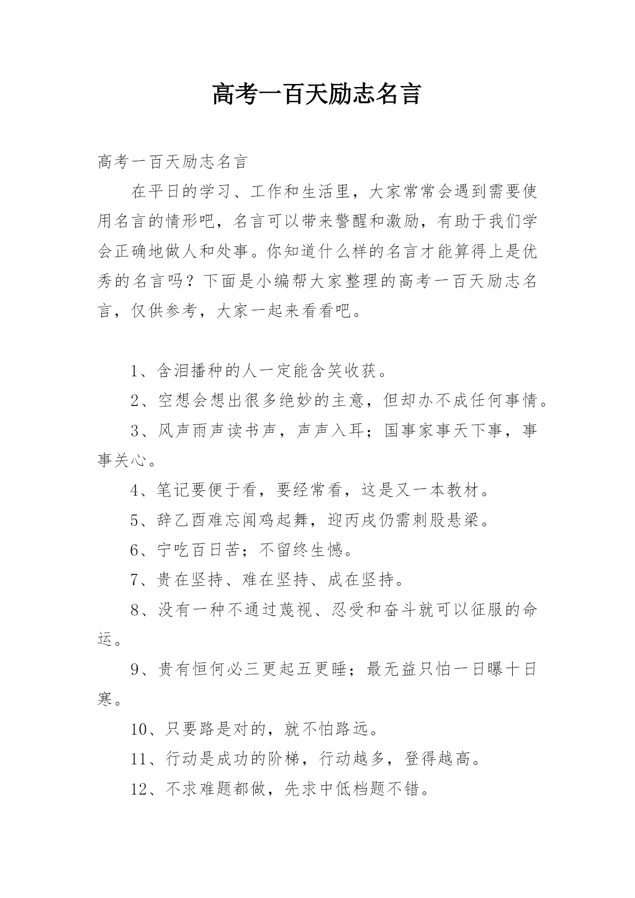 高考一百天励志名言高考一百天励志名言在平日的学习、工作和生活里,大家常常会遇到需要使用名言的情形吧,名言可以带来警醒和激励,有助于我们学会正确地做人和处事。你知道什么样的名言才能算得上是优秀的名言吗?下面是小编帮大家整理的高考一百天励志名言,仅供参考,大家一起来看看吧。1、含泪播种的人一定能含笑收获。2、空想会想出很多绝妙的主意,但却办不成任何事情。3、风声雨声读书声,声声入耳;国事家事天下事,事事关心。4、笔记要便于看,要经常看,这是又一本教材。5、辞乙酉难忘闻鸡起舞,迎丙戌仍需刺股悬梁。6、宁吃百日苦