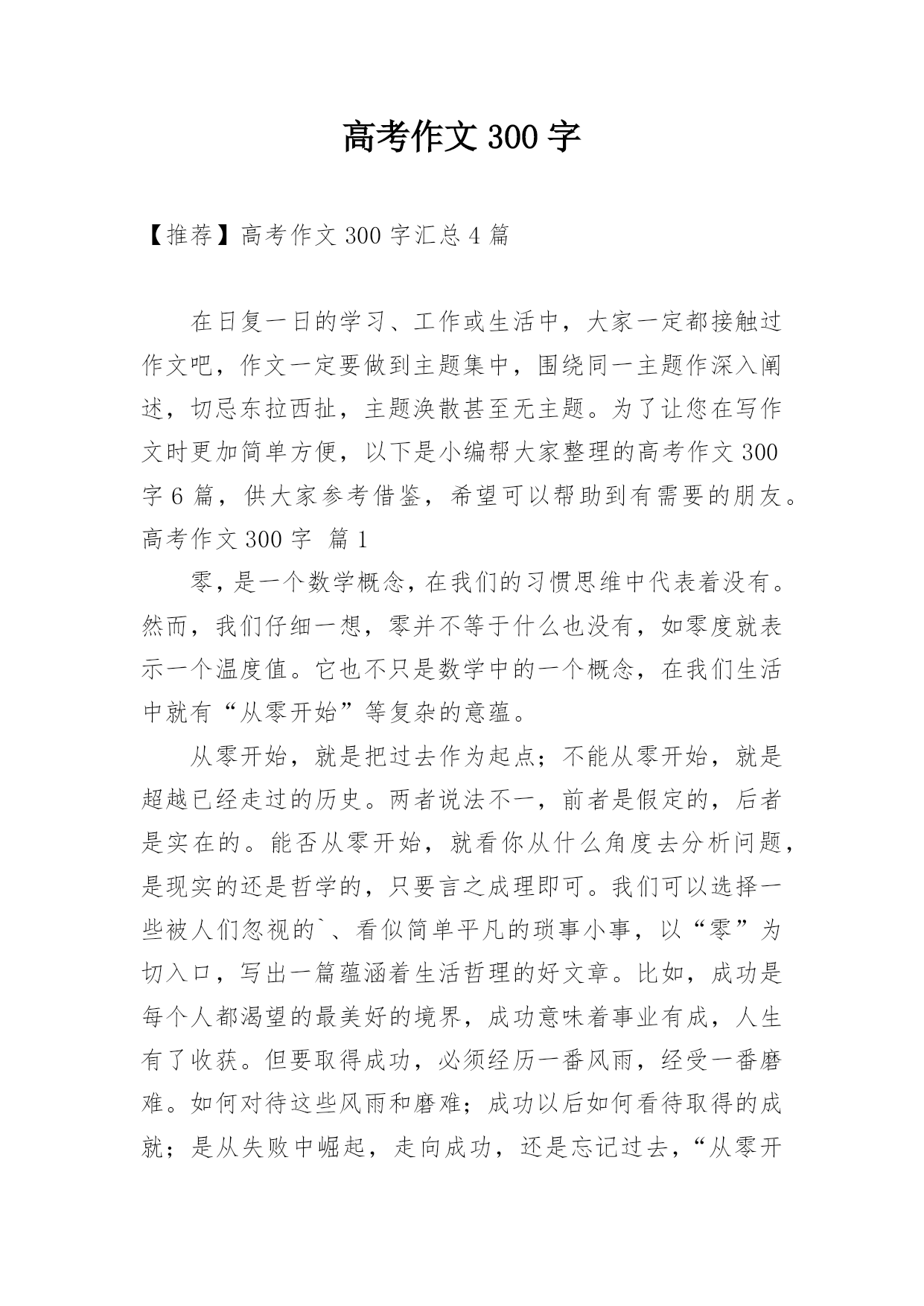 高考作文300字【推荐】高考作文300字汇总4篇在日复一日的学习、工作或生活中,大家一定都接触过作文吧,作文一定要做到主题集中,围绕同一主题作深入阐述,切忌东拉西扯,主题涣散甚至无主题。为了让您在写作文时更加简单方便,以下是小编帮大家整理的高考作文300字6篇,供大家参考借鉴,希望可以帮助到有需要的朋友。高考作文300字篇1零,是一个数学概念,在我们的习惯思维中代表着没有。然而,我们仔细一想,零并不等于什么也没有,如零度就表示一个温度值。它也不只是数学中的一个概念,在我们生活中就有“从零开始”等复杂的意蕴