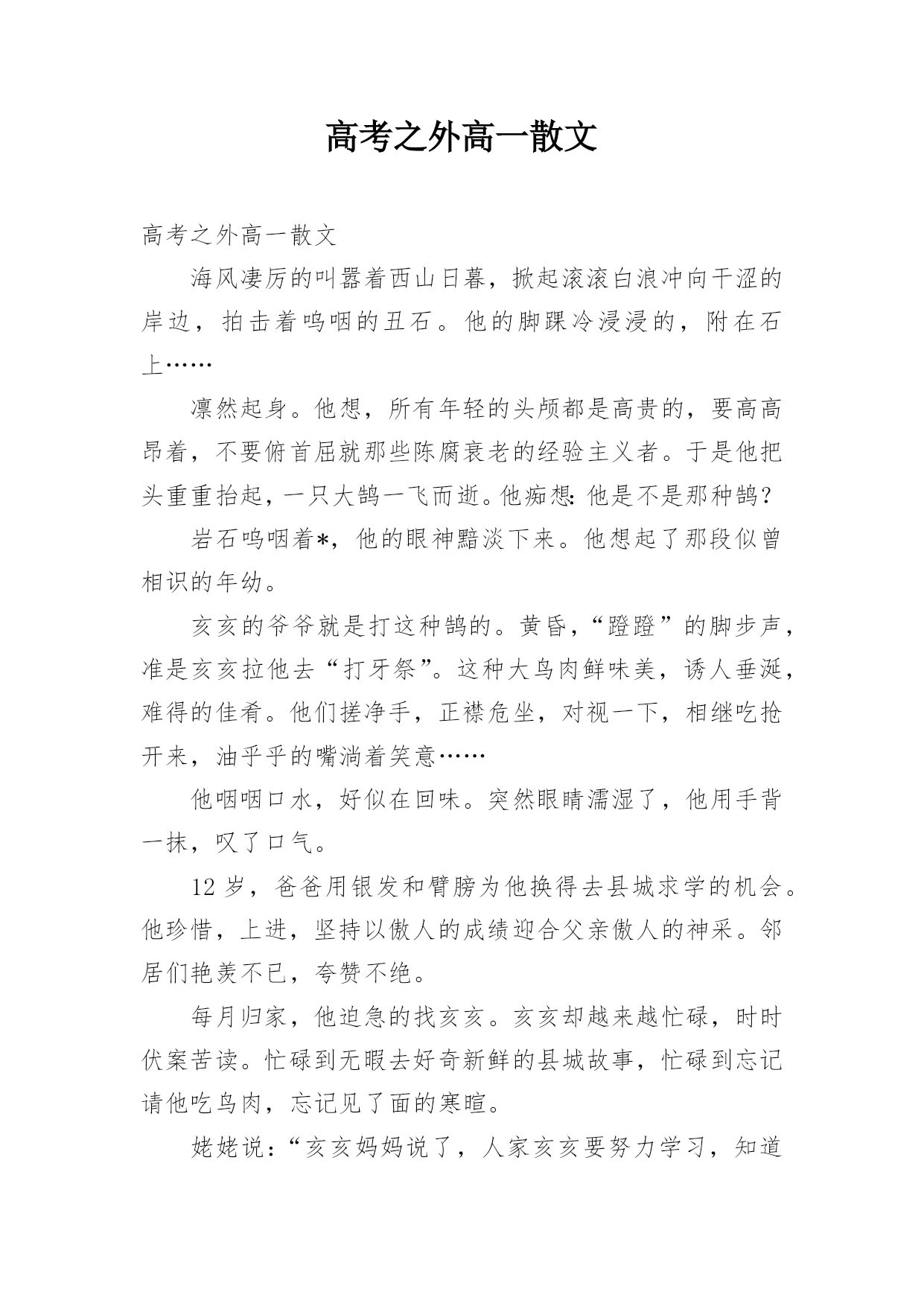 高考之外高一散文高考之外高一散文海风凄厉的叫嚣着西山日暮,掀起滚滚白浪冲向干涩的岸边,拍击着呜咽的丑石。他的脚踝冷浸浸的,附在石上……凛然起身。他想,所有年轻的头颅都是高贵的,要高高昂着,不要俯首屈就那些陈腐衰老的经验主义者。于是他把头重重抬起,一只大鹄一飞而逝。他痴想:他是不是那种鹄?岩石呜咽着*,他的眼神黯淡下来。他想起了那段似曾相识的年幼。亥亥的爷爷就是打这种鹄的。黄昏,“蹬蹬”的脚步声,准是亥亥拉他去“打牙祭”。这种大鸟肉鲜味美,诱人垂涎,难得的佳肴。他们搓净手,正襟危坐,对视一下,相继吃抢开来,