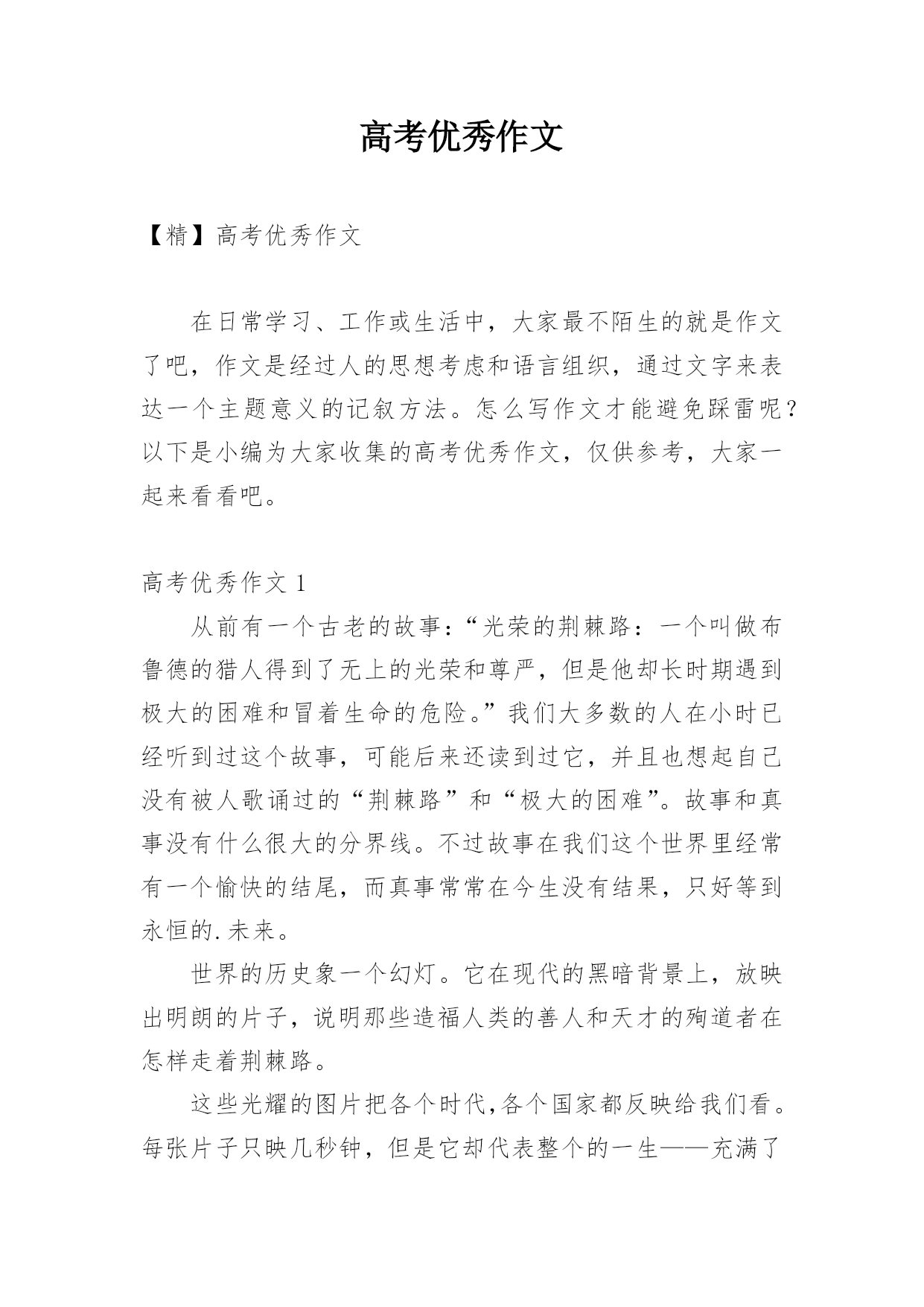 高考优秀作文【精】高考优秀作文在日常学习、工作或生活中,大家最不陌生的就是作文了吧,作文是经过人的思想考虑和语言组织,通过文字来表达一个主题意义的记叙方法。怎么写作文才能避免踩雷呢?以下是小编为大家收集的高考优秀作文,仅供参考,大家一起来看看吧。高考优秀作文1从前有一个古老的故事:“光荣的荆棘路:一个叫做布鲁德的猎人得到了无上的光荣和尊严,但是他却长时期遇到极大的困难和冒着生命的危险。”我们大多数的人在小时已经听到过这个故事,可能后来还读到过它,并且也想起自己没有被人歌诵过的“荆棘路”和“极大的困难”。故