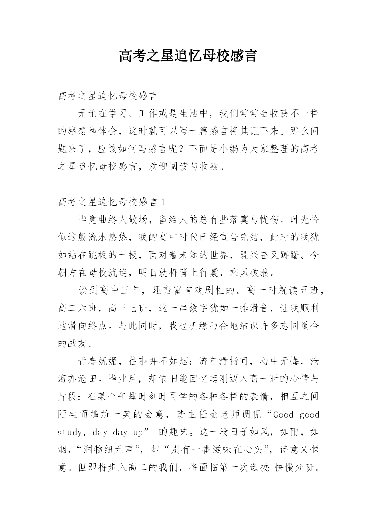 高考之星追忆母校感言高考之星追忆母校感言无论在学习、工作或是生活中,我们常常会收获不一样的感想和体会,这时就可以写一篇感言将其记下来。那么问题来了,应该如何写感言呢?下面是小编为大家整理的高考之星追忆母校感言,欢迎阅读与收藏。高考之星追忆母校感言1毕竟曲终人散场,留给人的总有些落寞与忧伤。时光恰似这般流水悠悠,我的高中时代已经宣告完结,此时的我犹如站在跳板的一极,面对着未知的世界,既兴奋又踌躇。今朝方在母校流连,明日就将背上行囊,乘风破浪。谈到高中三年,还蛮富有戏剧性的。高一时就读五班,高二六班,高三七班