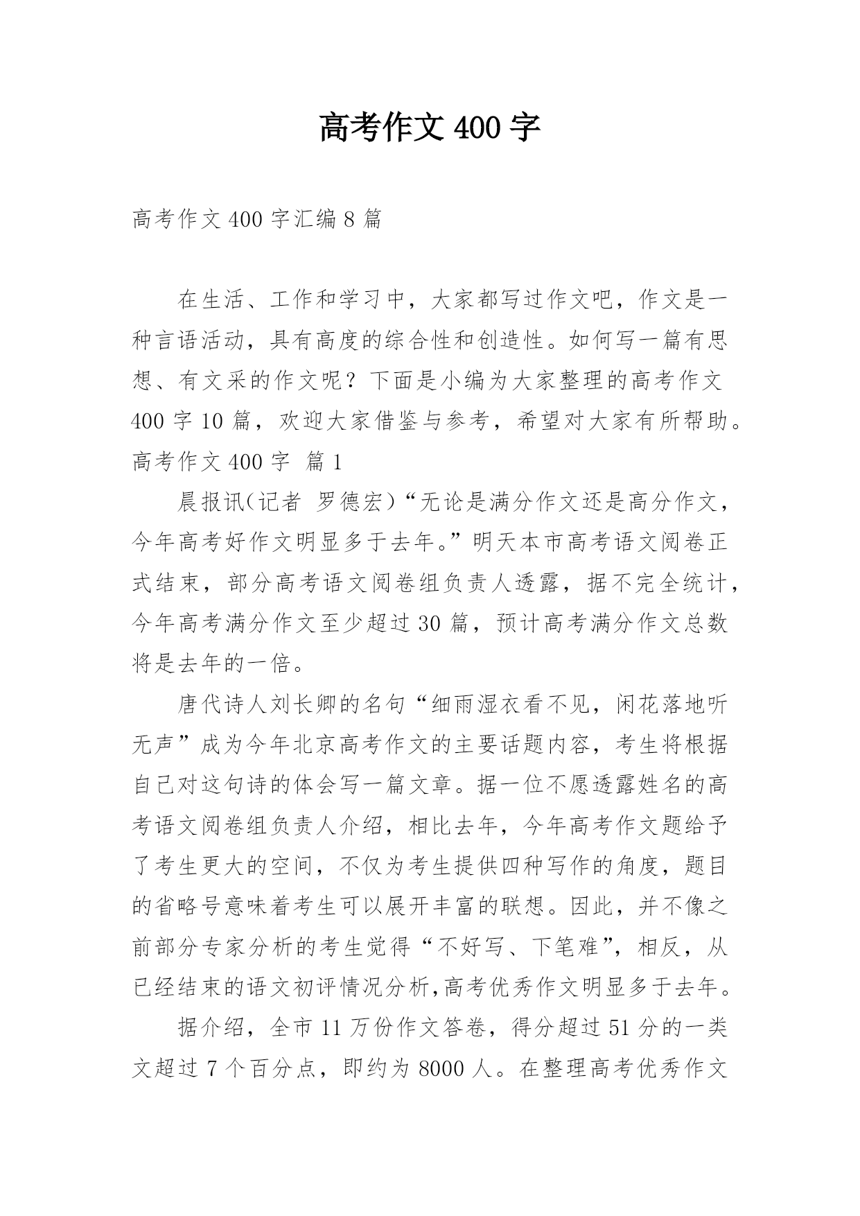 高考作文400字高考作文400字汇编8篇在生活、工作和学习中,大家都写过作文吧,作文是一种言语活动,具有高度的综合性和创造性。如何写一篇有思想、有文采的作文呢?下面是小编为大家整理的高考作文400字10篇,欢迎大家借鉴与参考,希望对大家有所帮助。高考作文400字篇1晨报讯(记者罗德宏)“无论是满分作文还是高分作文,今年高考好作文明显多于去年。”明天本市高考语文阅卷正式结束,部分高考语文阅卷组负责人透露,据不完全统计,今年高考满分作文至少超过30篇,预计高考满分作文总数将是去年的一倍。唐代诗人刘长卿的名句“