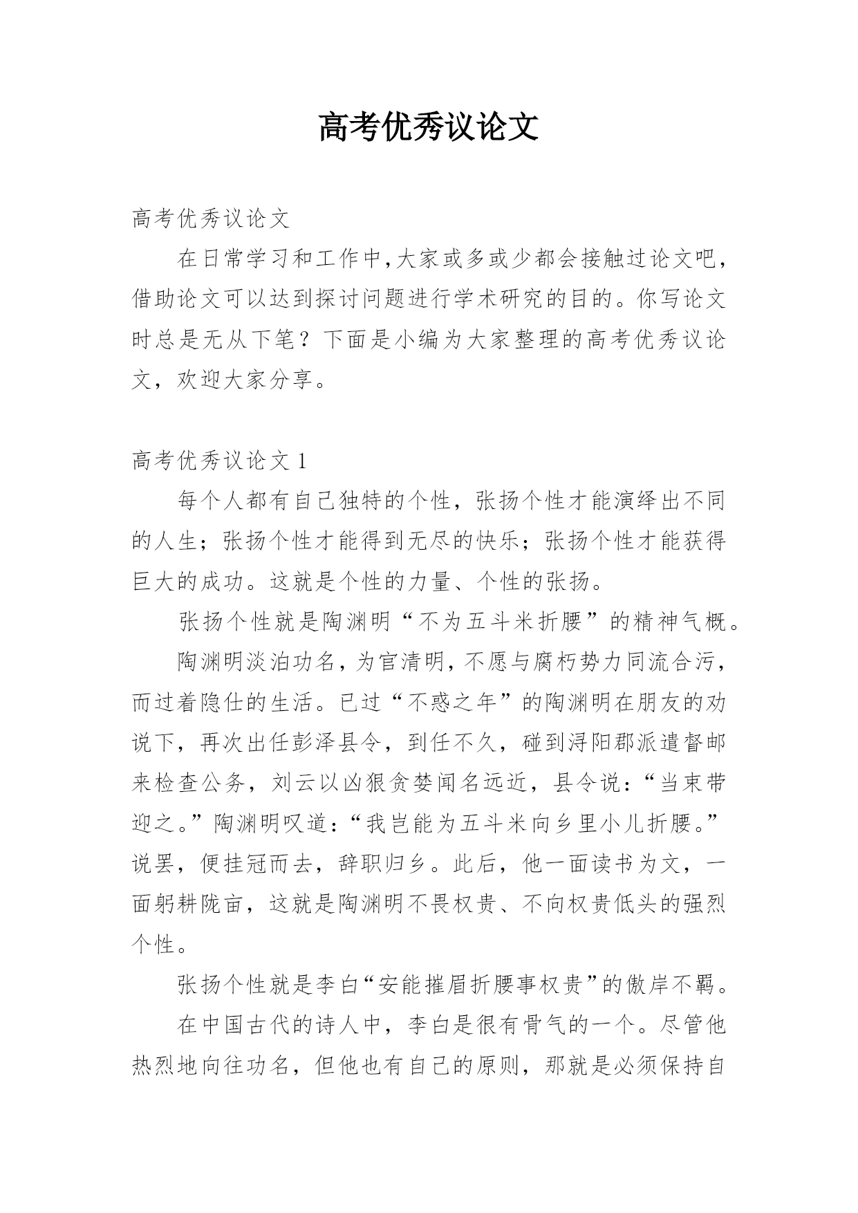 高考优秀议论文高考优秀议论文在日常学习和工作中,大家或多或少都会接触过论文吧,借助论文可以达到探讨问题进行学术研究的目的。你写论文时总是无从下笔?下面是小编为大家整理的高考优秀议论文,欢迎大家分享。高考优秀议论文1每个人都有自己独特的个性,张扬个性才能演绎出不同的人生;张扬个性才能得到无尽的快乐;张扬个性才能获得巨大的成功。这就是个性的力量、个性的张扬。张扬个性就是陶渊明“不为五斗米折腰”的精神气概。陶渊明淡泊功名,为官清明,不愿与腐朽势力同流合污,而过着隐仕的生活。已过“不惑之年”的陶渊明在朋友的劝说下