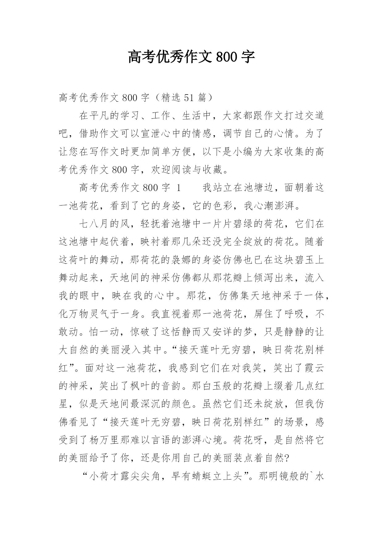 高考优秀作文800字高考优秀作文800字(精选51篇)在平凡的学习、工作、生活中,大家都跟作文打过交道吧,借助作文可以宣泄心中的情感,调节自己的心情。为了让您在写作文时更加简单方便,以下是小编为大家收集的高考优秀作文800字,欢迎阅读与收藏。高考优秀作文800字1我站立在池塘边,面朝着这一池荷花,看到了它的身姿,它的色彩,我心潮澎湃。七八月的风,轻抚着池塘中一片片碧绿的荷花,它们在这池塘中起伏着,映衬着那几朵还没完全绽放的荷花。随着这荷叶的舞动,那荷花的袅娜的身姿仿佛也已在这块碧玉上舞动起来,天地间的神采