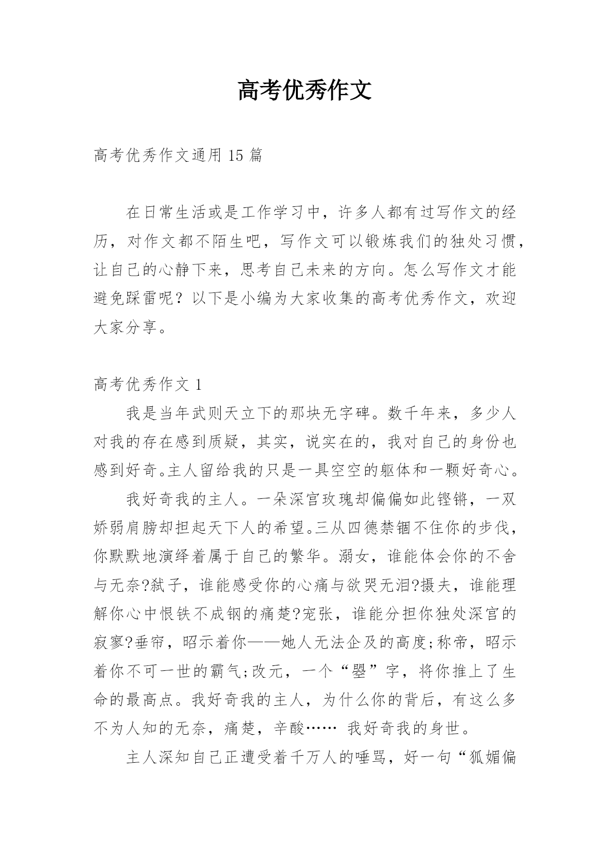 高考优秀作文高考优秀作文通用15篇在日常生活或是工作学习中,许多人都有过写作文的经历,对作文都不陌生吧,写作文可以锻炼我们的独处习惯,让自己的心静下来,思考自己未来的方向。怎么写作文才能避免踩雷呢?以下是小编为大家收集的高考优秀作文,欢迎大家分享。高考优秀作文1我是当年武则天立下的那块无字碑。数千年来,多少人对我的存在感到质疑,其实,说实在的,我对自己的身份也感到好奇。主人留给我的只是一具空空的躯体和一颗好奇心。我好奇我的主人。一朵深宫玫瑰却偏偏如此铿锵,一双娇弱肩膀却担起天下人的希望。三从四德禁锢不住你