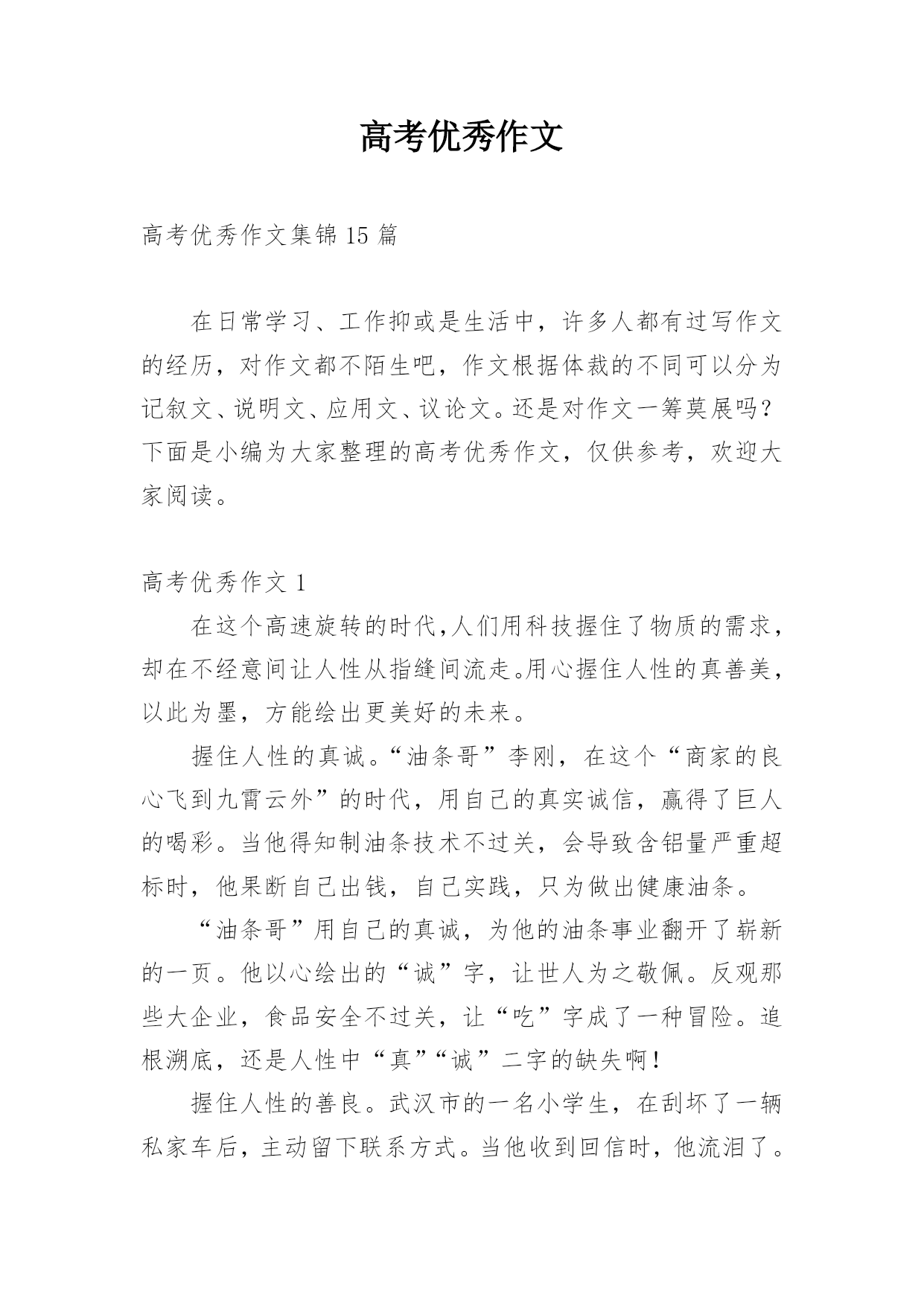 高考优秀作文高考优秀作文集锦15篇在日常学习、工作抑或是生活中,许多人都有过写作文的经历,对作文都不陌生吧,作文根据体裁的不同可以分为记叙文、说明文、应用文、议论文。还是对作文一筹莫展吗?下面是小编为大家整理的高考优秀作文,仅供参考,欢迎大家阅读。高考优秀作文1在这个高速旋转的时代,人们用科技握住了物质的需求,却在不经意间让人性从指缝间流走。用心握住人性的真善美,以此为墨,方能绘出更美好的未来。握住人性的真诚。“油条哥”李刚,在这个“商家的良心飞到九霄云外”的时代,用自己的真实诚信,赢得了巨人的喝彩。当他