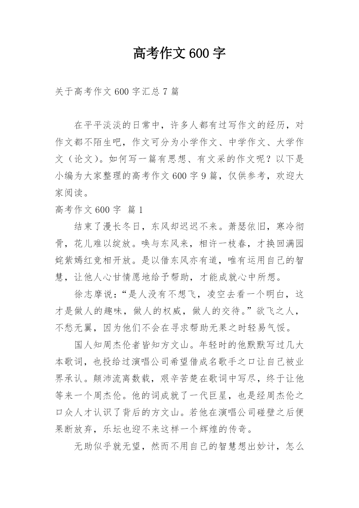 高考作文600字关于高考作文600字汇总7篇在平平淡淡的日常中,许多人都有过写作文的经历,对作文都不陌生吧,作文可分为小学作文、中学作文、大学作文(论文)。如何写一篇有思想、有文采的作文呢?以下是小编为大家整理的高考作文600字9篇,仅供参考,欢迎大家阅读。高考作文600字篇1结束了漫长冬日,东风却迟迟不来。萧瑟依旧,寒冷彻骨,花儿难以绽放。唤与东风来,相许一枝春,才换回满园姹紫嫣红竞相开放。是以借东风亦有道,唯有运用自己的智慧,让他人心甘情愿地给予帮助,才能成就心中所想。徐志摩说:“是人没有不想飞,凌空