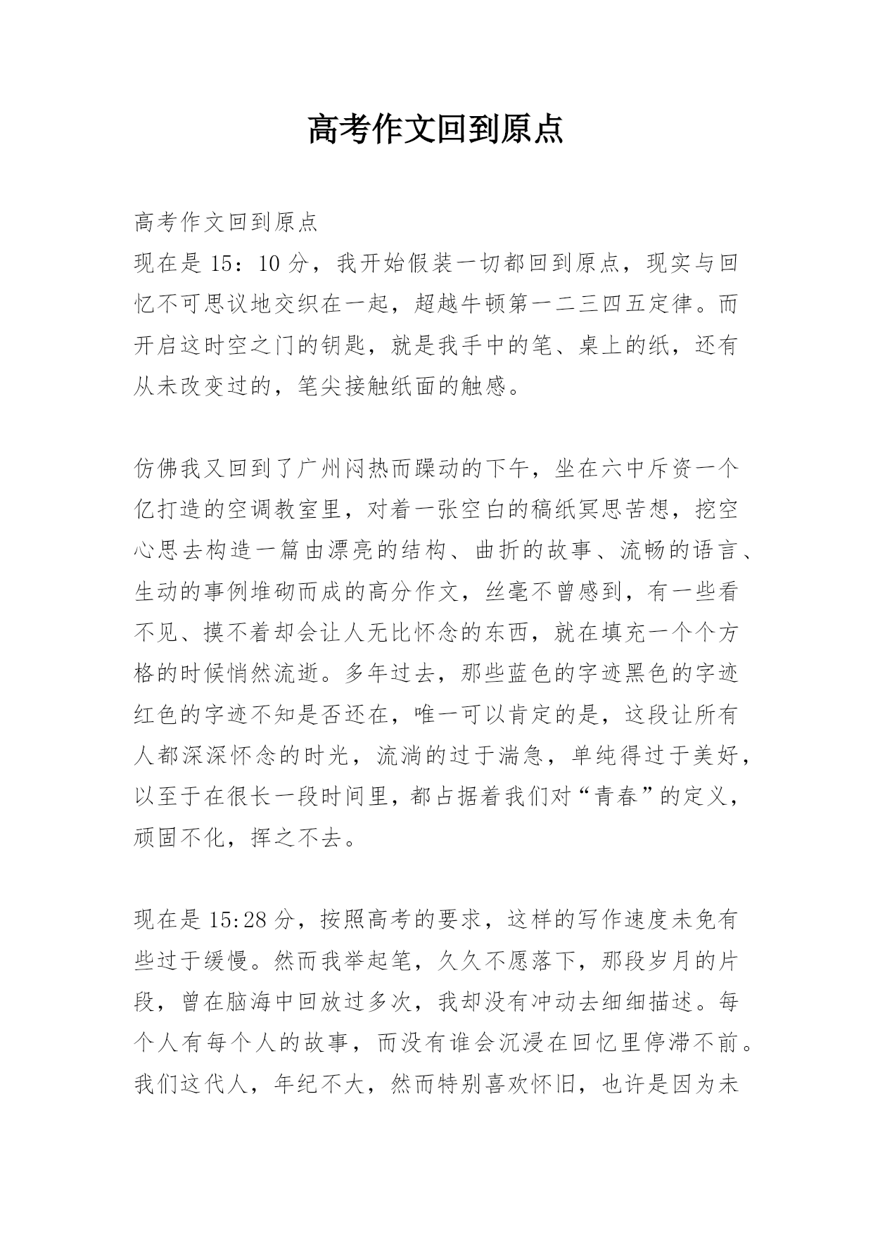 高考作文回到原点高考作文回到原点现在是15:10分,我开始假装一切都回到原点,现实与回忆不可思议地交织在一起,超越牛顿第一二三四五定律。而开启这时空之门的钥匙,就是我手中的笔、桌上的纸,还有从未改变过的,笔尖接触纸面的触感。仿佛我又回到了广州闷热而躁动的下午,坐在六中斥资一个亿打造的空调教室里,对着一张空白的稿纸冥思苦想,挖空心思去构造一篇由漂亮的结构、曲折的故事、流畅的语言、生动的事例堆砌而成的高分作文,丝毫不曾感到,有一些看不见、摸不着却会让人无比怀念的东西,就在填充一个个方格的时候悄然流逝。多年过去