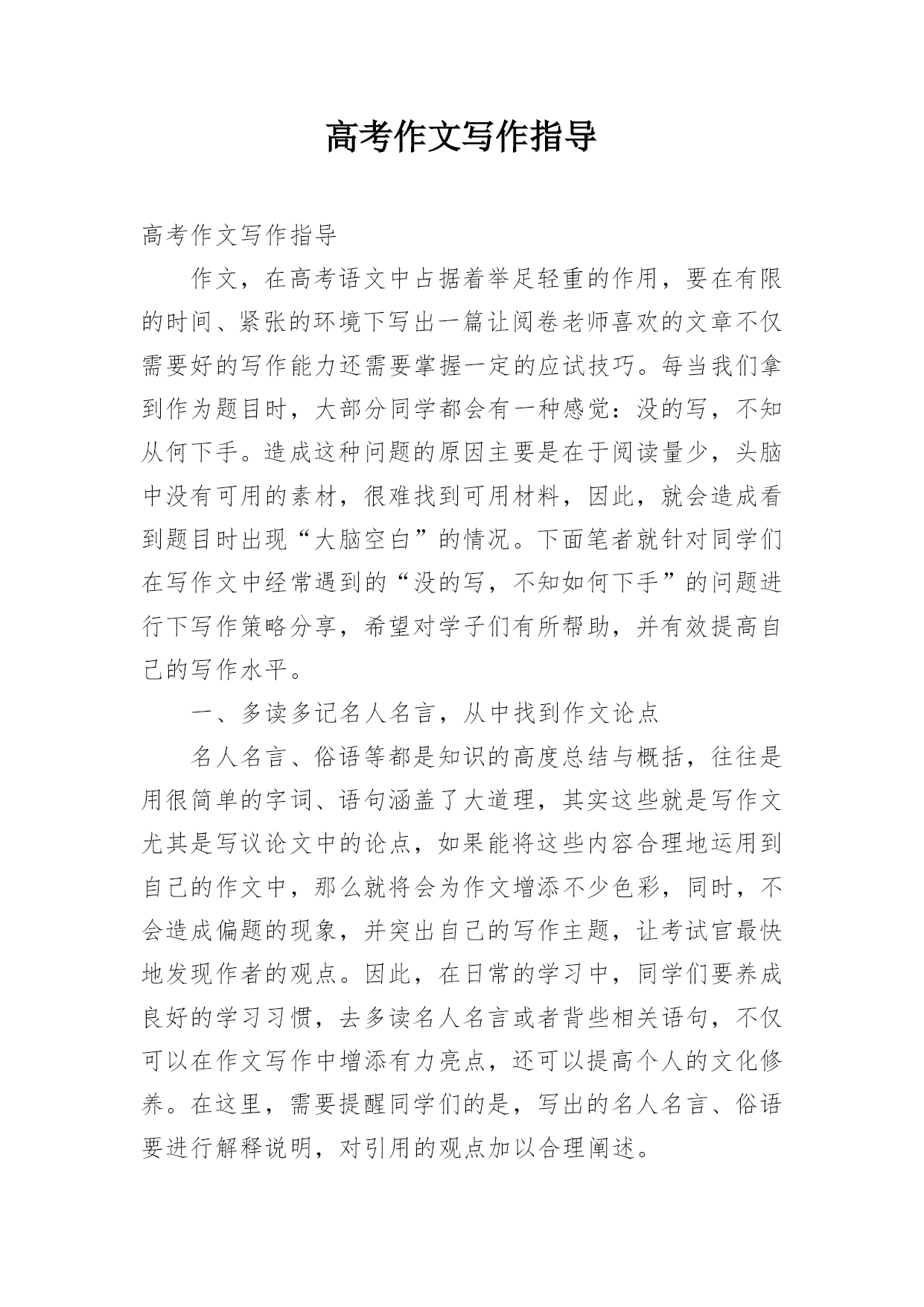 高考作文写作指导高考作文写作指导作文,在高考语文中占据着举足轻重的作用,要在有限的时间、紧张的环境下写出一篇让阅卷老师喜欢的文章不仅需要好的写作能力还需要掌握一定的应试技巧。每当我们拿到作为题目时,大部分同学都会有一种感觉:没的写,不知从何下手。造成这种问题的原因主要是在于阅读量少,头脑中没有可用的素材,很难找到可用材料,因此,就会造成看到题目时出现“大脑空白”的情况。下面笔者就针对同学们在写作文中经常遇到的“没的写,不知如何下手”的问题进行下写作策略分享,希望对学子们有所帮助,并有效提高自己的写作水平。