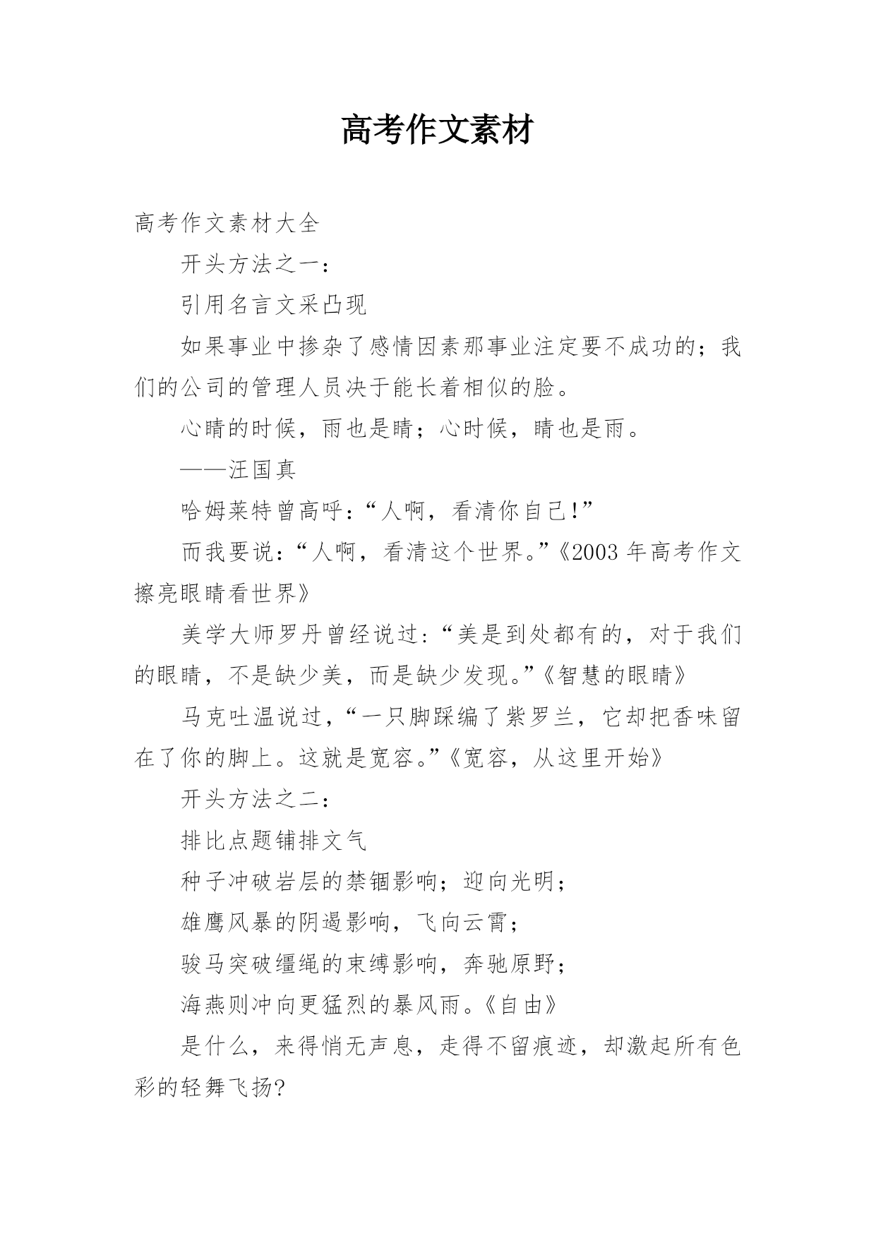高考作文素材高考作文素材大全开头方法之一:引用名言文采凸现如果事业中掺杂了感情因素那事业注定要不成功的;我们的公司的管理人员决于能长着相似的脸。心睛的时候,雨也是睛;心时候,睛也是雨。——汪国真哈姆莱特曾高呼:“人啊,看清你自己!”而我要说:“人啊,看清这个世界。”《2003年高考作文擦亮眼睛看世界》美学大师罗丹曾经说过:“美是到处都有的,对于我们的眼睛,不是缺少美,而是缺少发现。”《智慧的眼睛》马克吐温说过,“一只脚踩编了紫罗兰,它却把香味留在了你的脚上。这就是宽容。”《宽容,从这里开始》开头方法之二: