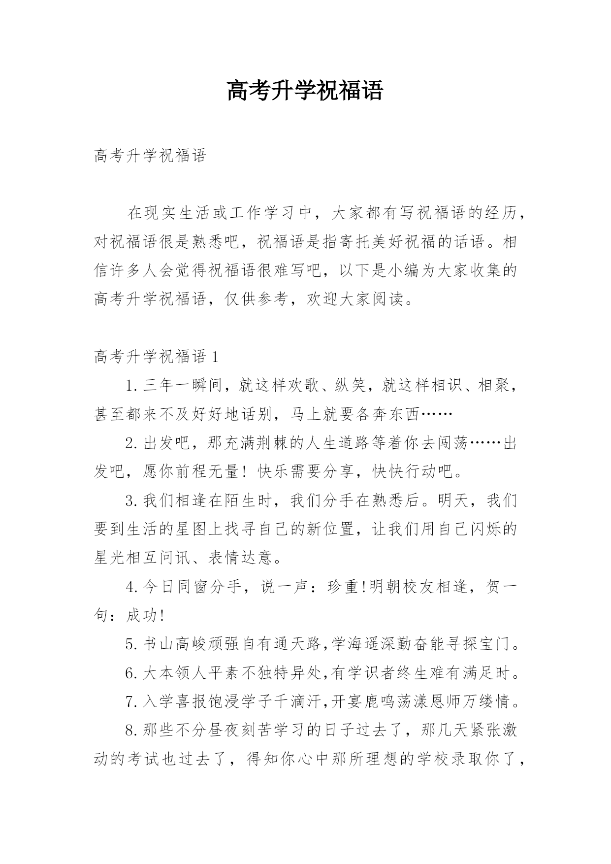 高考升学祝福语高考升学祝福语在现实生活或工作学习中,大家都有写祝福语的经历,对祝福语很是熟悉吧,祝福语是指寄托美好祝福的话语。相信许多人会觉得祝福语很难写吧,以下是小编为大家收集的高考升学祝福语,仅供参考,欢迎大家阅读。高考升学祝福语11.三年一瞬间,就这样欢歌、纵笑,就这样相识、相聚,甚至都来不及好好地话别,马上就要各奔东西……2.出发吧,那充满荆棘的人生道路等着你去闯荡……出发吧,愿你前程无量!快乐需要分享,快快行动吧。3.我们相逢在陌生时,我们分手在熟悉后。明天,我们要到生活的星图上找寻自己的新位置