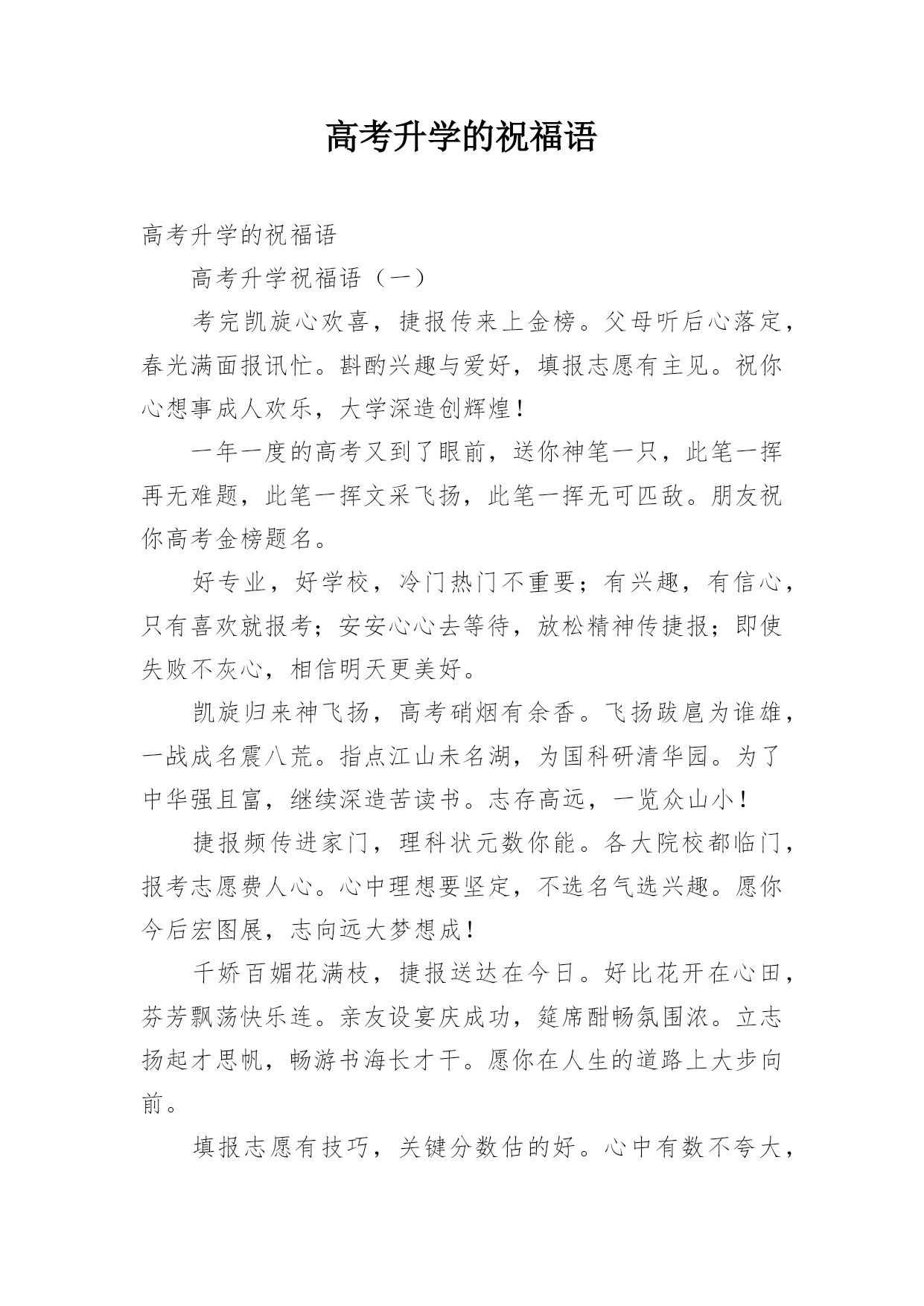 高考升学的祝福语高考升学的祝福语高考升学祝福语(一)考完凯旋心欢喜,捷报传来上金榜。父母听后心落定,春光满面报讯忙。斟酌兴趣与爱好,填报志愿有主见。祝你心想事成人欢乐,大学深造创辉煌!一年一度的高考又到了眼前,送你神笔一只,此笔一挥再无难题,此笔一挥文采飞扬,此笔一挥无可匹敌。朋友祝你高考金榜题名。好专业,好学校,冷门热门不重要;有兴趣,有信心,只有喜欢就报考;安安心心去等待,放松精神传捷报;即使失败不灰心,相信明天更美好。凯旋归来神飞扬,高考硝烟有余香。飞扬跋扈为谁雄,一战成名震八荒。指点江山未名湖,为