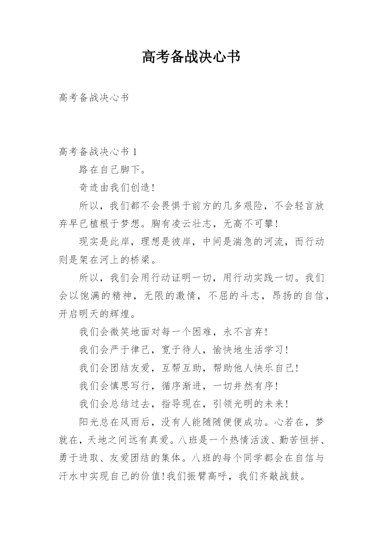 高考备战决心书高考备战决心书高考备战决心书1路在自己脚下。奇迹由我们创造!所以,我们都不会畏惧于前方的几多艰险,不会轻言放弃早已植根于梦想。胸有凌云壮志,无高不可攀!现实是此岸,理想是彼岸,中间是湍急的河流,而行动则是架在河上的桥梁。所以,我们会用行动证明一切,用行动实践一切。我们会以饱满的精神,无限的激情,不屈的斗志,昂扬的自信,开启明天的辉煌。我们会微笑地面对每一个困难,永不言弃!我们会严于律己,宽于待人,愉快地生活学习!我们会团结友爱,互帮互助,帮助他人快乐自己!我们会慎思写行,循序渐进,一切井然有