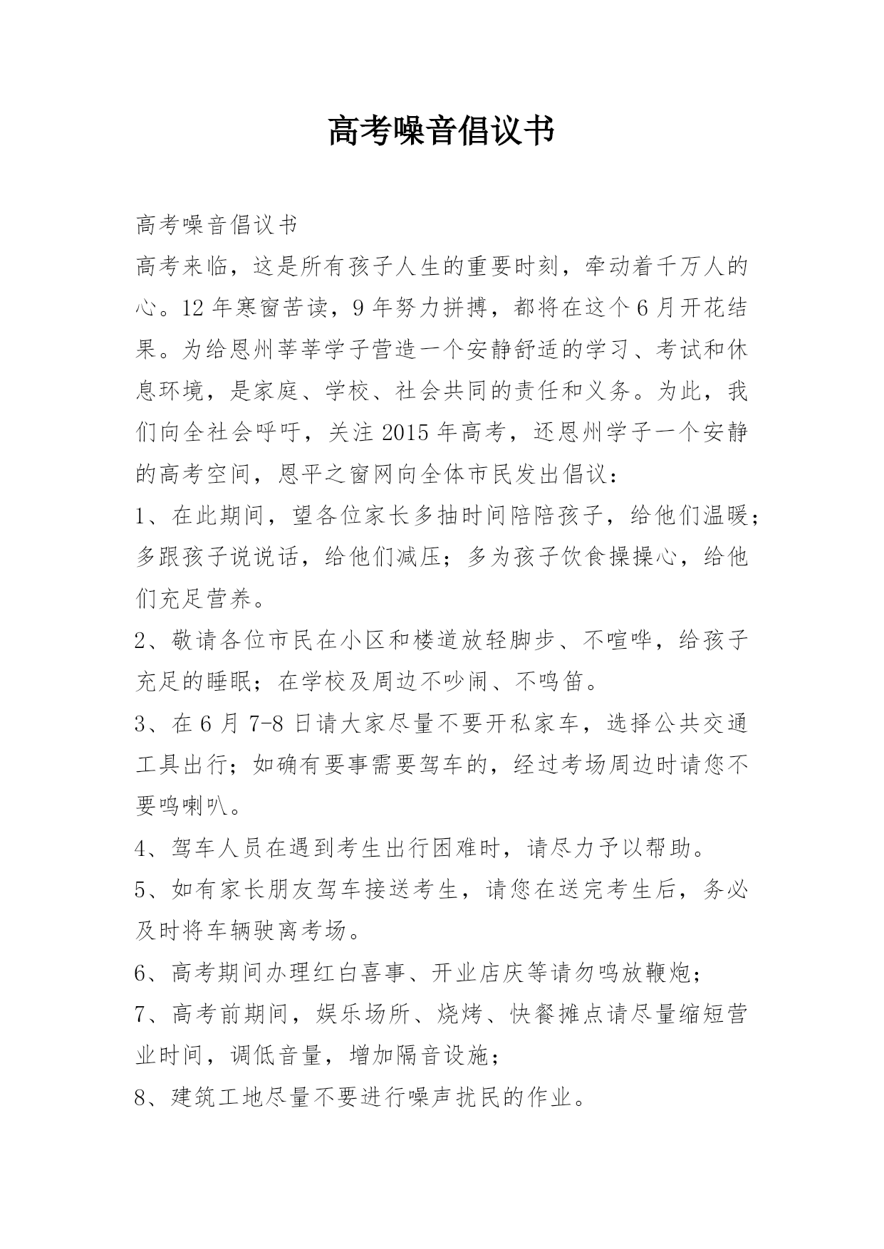 高考噪音倡议书高考噪音倡议书高考来临,这是所有孩子人生的重要时刻,牵动着千万人的心。12年寒窗苦读,9年努力拼搏,都将在这个6月开花结果。为给恩州莘莘学子营造一个安静舒适的学习、考试和休息环境,是家庭、学校、社会共同的责任和义务。为此,我们向全社会呼吁,关注2015年高考,还恩州学子一个安静的高考空间,恩平之窗网向全体市民发出倡议:1、在此期间,望各位家长多抽时间陪陪孩子,给他们温暖;多跟孩子说说话,给他们减压;多为孩子饮食操操心,给他们充足营养。2、敬请各位市民在小区和楼道放轻脚步、不喧哗,给孩子充足的