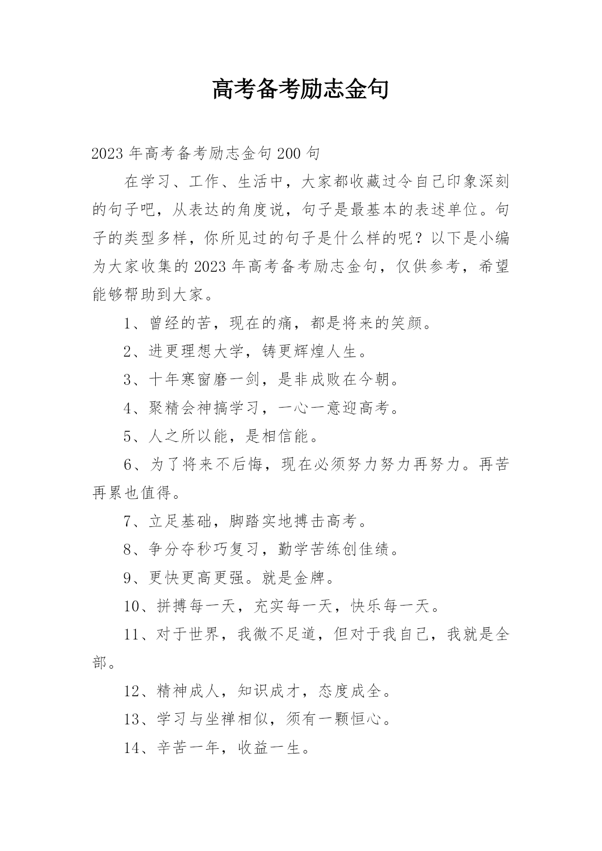 高考备考励志金句2023年高考备考励志金句200句在学习、工作、生活中,大家都收藏过令自己印象深刻的句子吧,从表达的角度说,句子是最基本的表述单位。句子的类型多样,你所见过的句子是什么样的呢?以下是小编为大家收集的2023年高考备考励志金句,仅供参考,希望能够帮助到大家。1、曾经的苦,现在的痛,都是将来的笑颜。2、进更理想大学,铸更辉煌人生。3、十年寒窗磨一剑,是非成败在今朝。4、聚精会神搞学习,一心一意迎高考。5、人之所以能,是相信能。6、为了将来不后悔,现在必须努力努力再努力。再苦再累也值得。7、立足