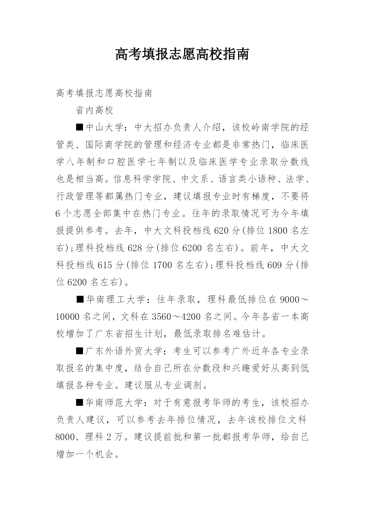 高考填报志愿高校指南高考填报志愿高校指南省内高校■中山大学:中大招办负责人介绍,该校岭南学院的经管类、国际商学院的管理和经济专业都是非常热门,临床医学八年制和口腔医学七年制以及临床医学专业录取分数线也是相当高。信息科学学院、中文系、语言类小语种、法学、行政管理等都属热门专业,建议填报专业时有梯度,不要将6个志愿全部集中在热门专业。往年的录取情况可为今年填报提供参考。去年,中大文科投档线620分(排位1800名左右);理科投档线628分(排位6200名左右)。前年,中大文科投档线615分(排位1700名左右