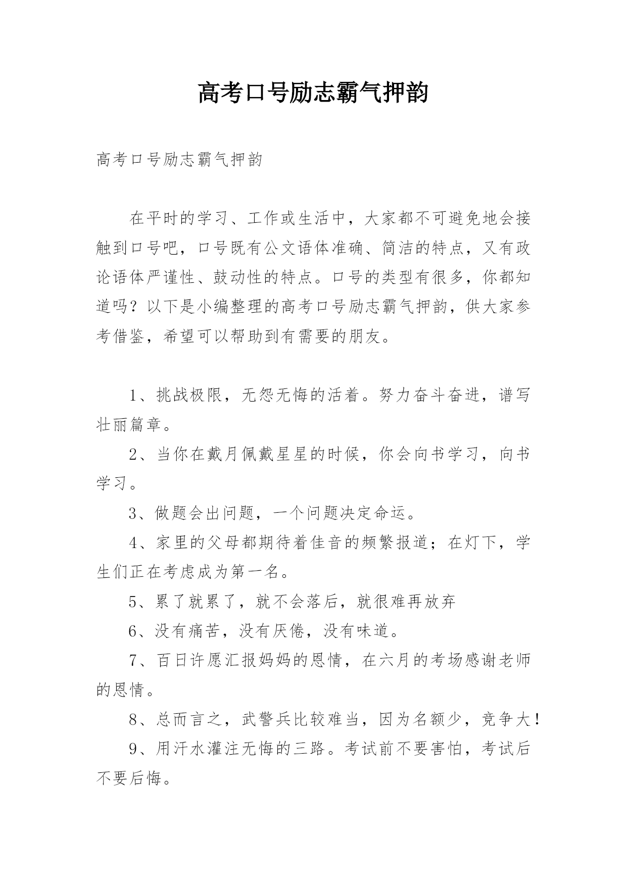 高考口号励志霸气押韵高考口号励志霸气押韵在平时的学习、工作或生活中,大家都不可避免地会接触到口号吧,口号既有公文语体准确、简洁的特点,又有政论语体严谨性、鼓动性的特点。口号的类型有很多,你都知道吗?以下是小编整理的高考口号励志霸气押韵,供大家参考借鉴,希望可以帮助到有需要的朋友。1、挑战极限,无怨无悔的活着。努力奋斗奋进,谱写壮丽篇章。2、当你在戴月佩戴星星的时候,你会向书学习,向书学习。3、做题会出问题,一个问题决定命运。4、家里的父母都期待着佳音的频繁报道;在灯下,学生们正在考虑成为第一名。5、累了就