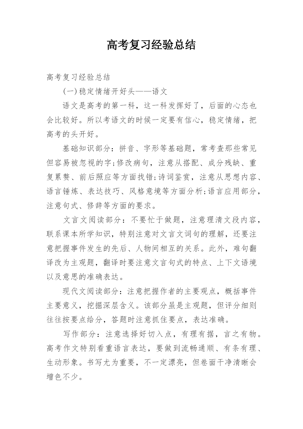 高考复习经验总结高考复习经验总结(一)稳定情绪开好头——语文语文是高考的第一科,这一科发挥好了,后面的心态也会比较好。所以考语文的时候一定要有信心,稳定情绪,把高考的头开好。基础知识部分:拼音、字形等基础题,常考查那些常见但容易被忽视的字;修改病句,注意从搭配、成分残缺、重复累赘、前后照应等方面找错;诗词鉴赏,注意从思想内容、语言锤炼、表达技巧、风格意境等方面分析;语言应用部分,注意句式、修辞等方面的要求。文言文阅读部分:不要忙于做题,注意理清文段内容,联系课本所学知识,特别注意对文言文词句的理解,还要注