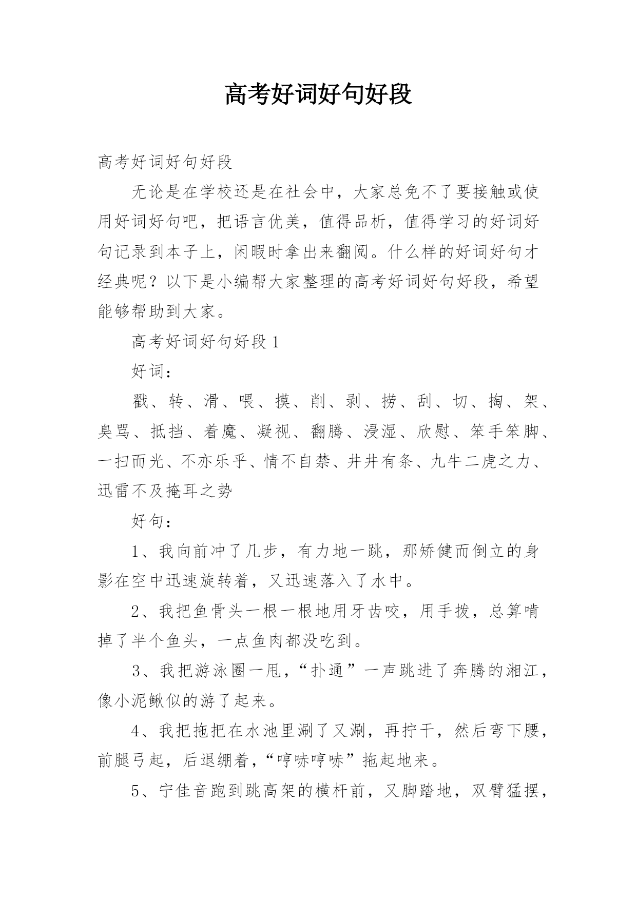 高考好词好句好段高考好词好句好段无论是在学校还是在社会中,大家总免不了要接触或使用好词好句吧,把语言优美,值得品析,值得学习的好词好句记录到本子上,闲暇时拿出来翻阅。什么样的好词好句才经典呢?以下是小编帮大家整理的高考好词好句好段,希望能够帮助到大家。高考好词好句好段1好词:戳、转、滑、喂、摸、削、剥、捞、刮、切、掏、架、臭骂、抵挡、着魔、凝视、翻腾、浸湿、欣慰、笨手笨脚、一扫而光、不亦乐乎、情不自禁、井井有条、九牛二虎之力、迅雷不及掩耳之势好句:1、我向前冲了几步,有力地一跳,那矫健而倒立的身影在空中迅